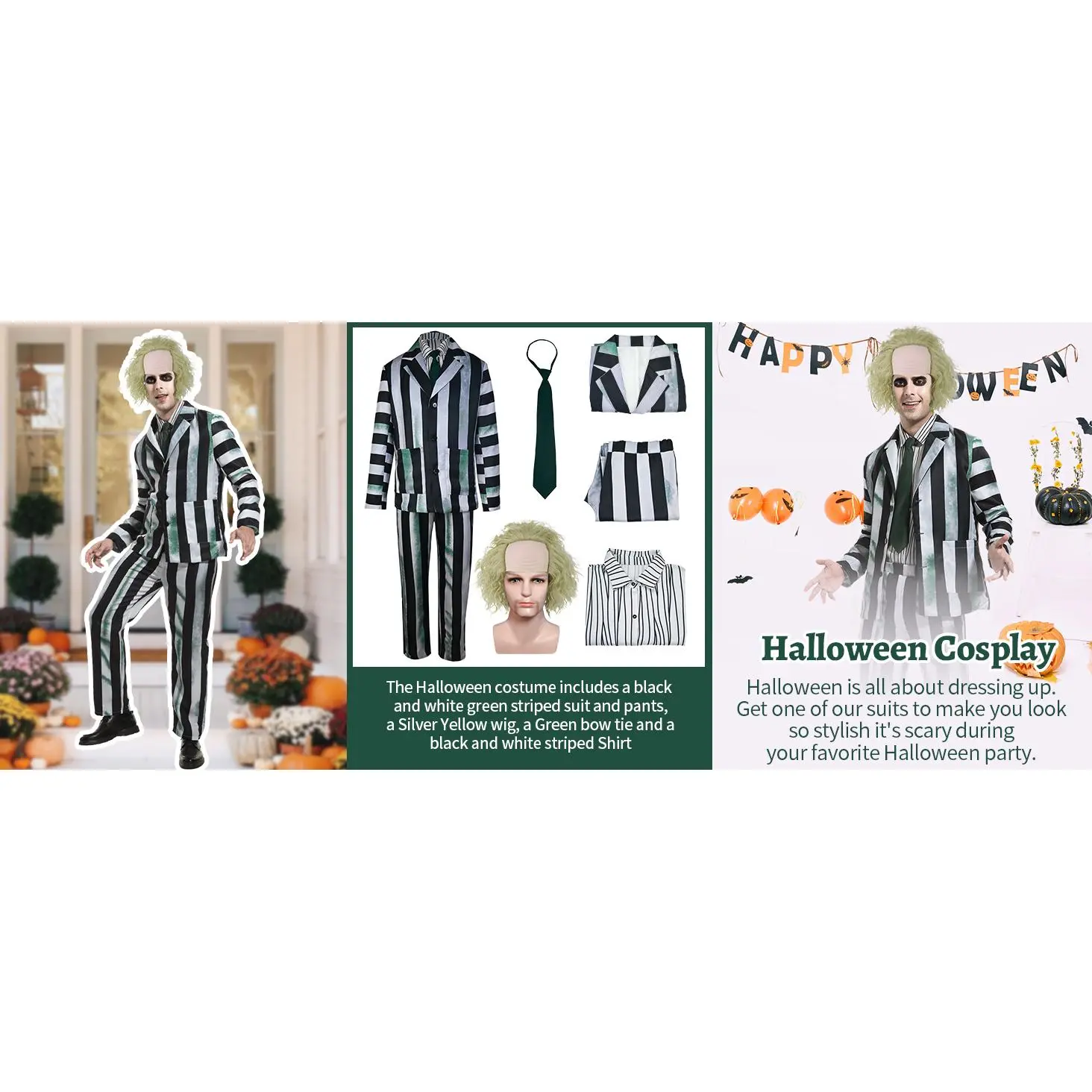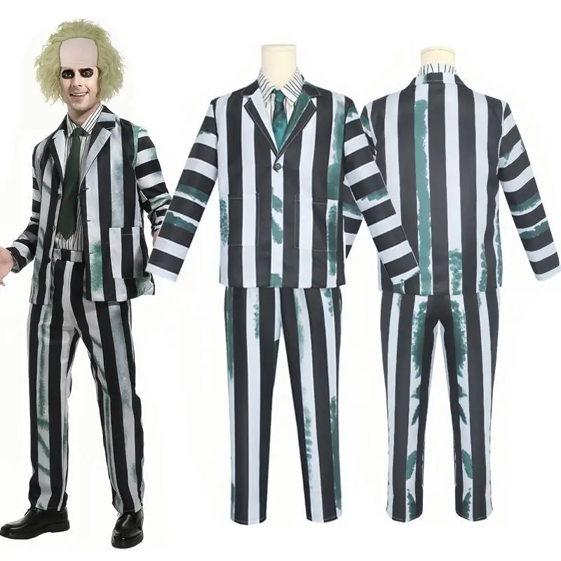 Adult Men Costume Black and White Striped Suit with Wig for Halloween Cosplay Party Outfit Horror Movie Character