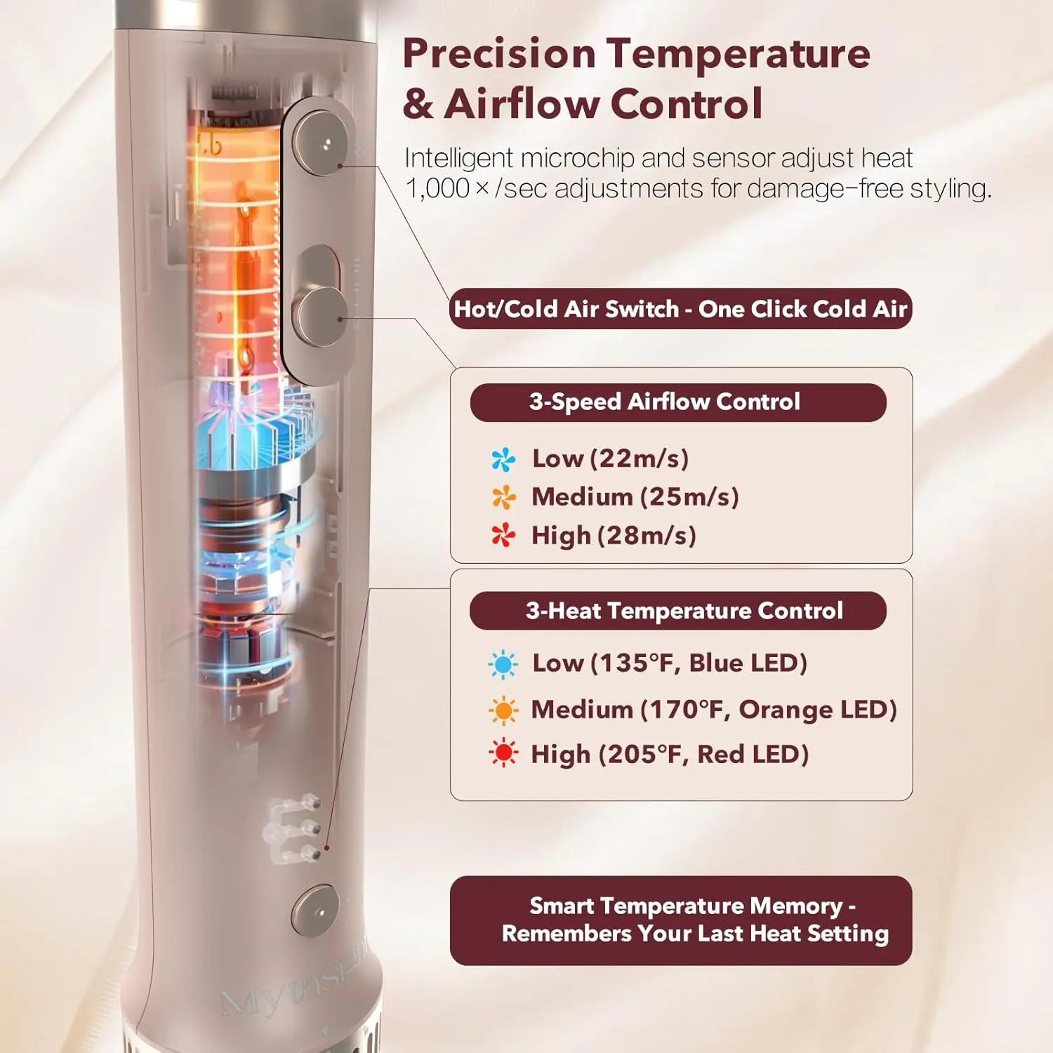 🔥 Precision Control, No Heat Damage 🔥 - 3 Heat Settings (135/170/205°F) + 3 Speeds: Dial the right combo for less heat and stress. - One-Touch Cool Shot: Locks shape and shine without holding the button.
