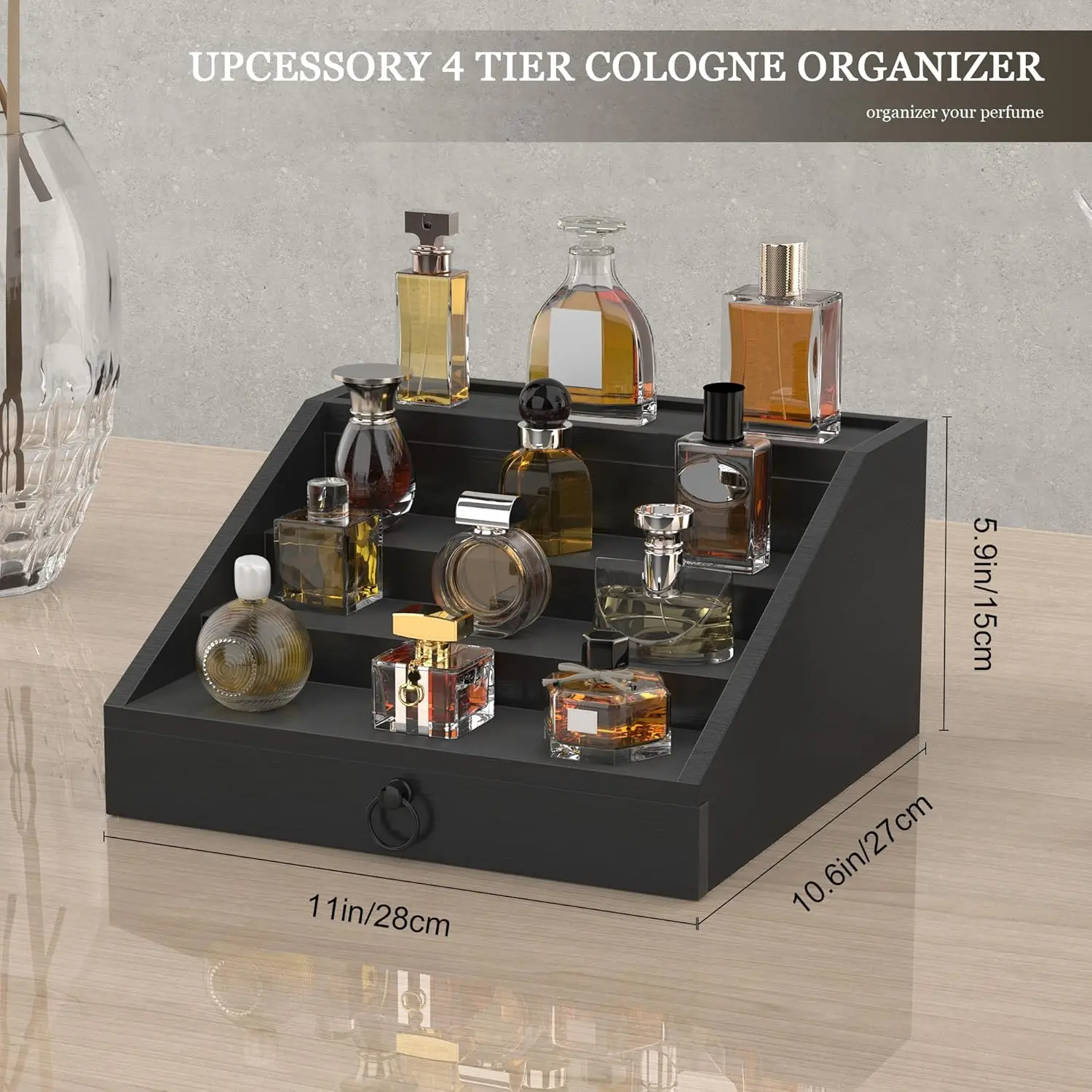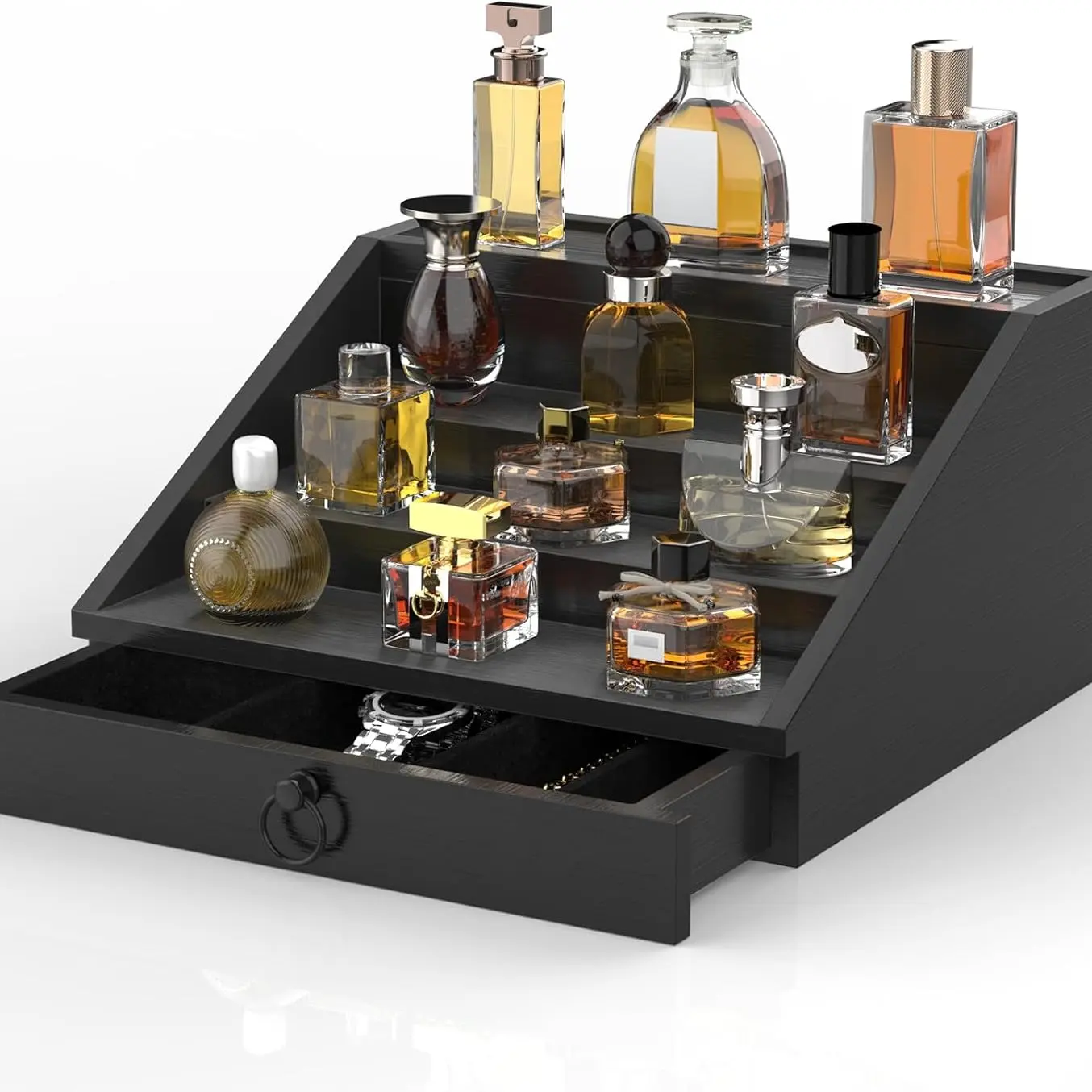 Wooden Cologne Organizer for Men 4 Tier Stand Shelf with Velvet Lined Drawer Hidden Storage Perfume Display Holder Classy Black Gift