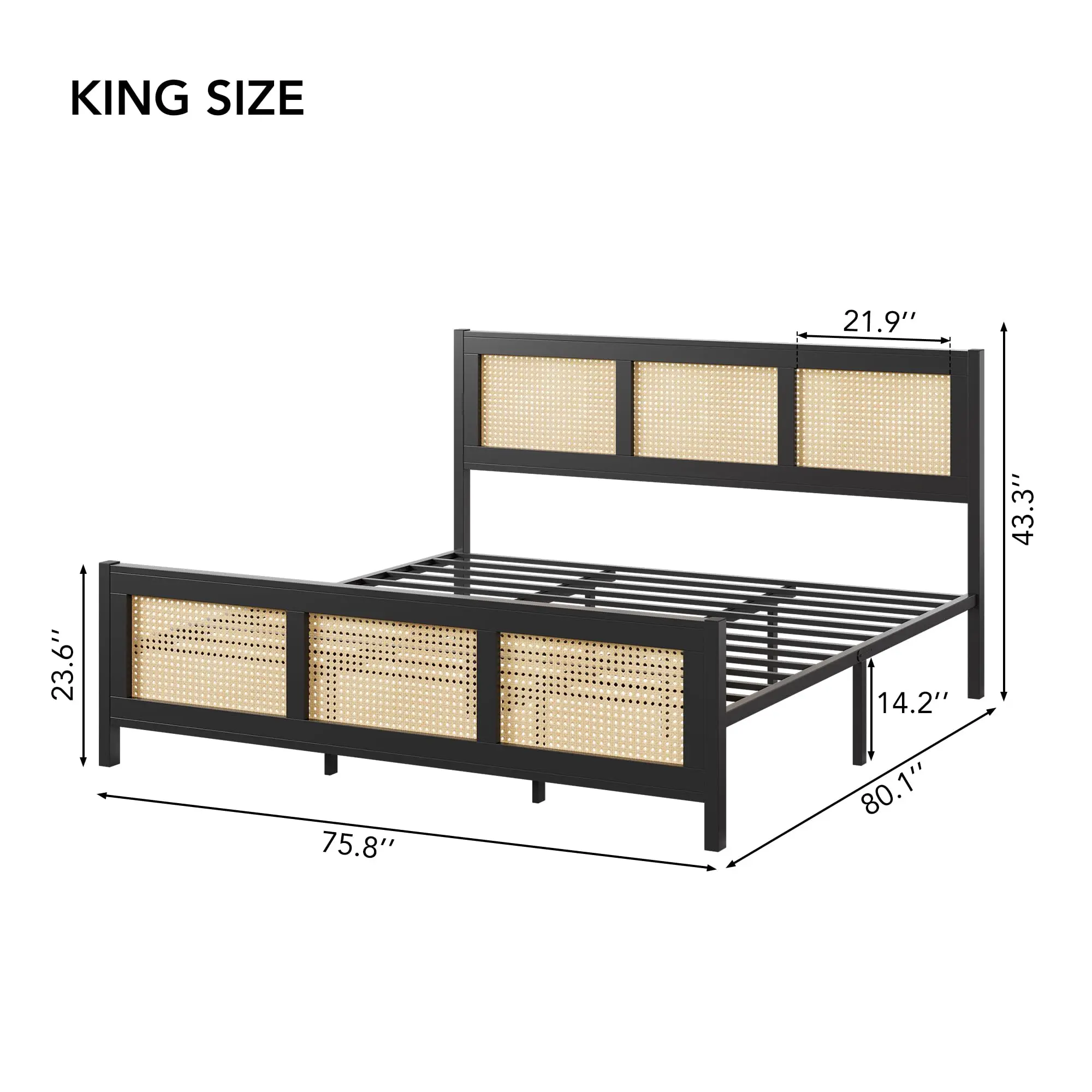 Garvee Boho Rattan Bed Frame with Cane Headboard, Available in King, Queen, and Full Sizes. Features Durable Metal Slats for Strong Support, Noise-Free Design, No Box Spring Needed, Modern Bedroom Furniture in Black or White.
