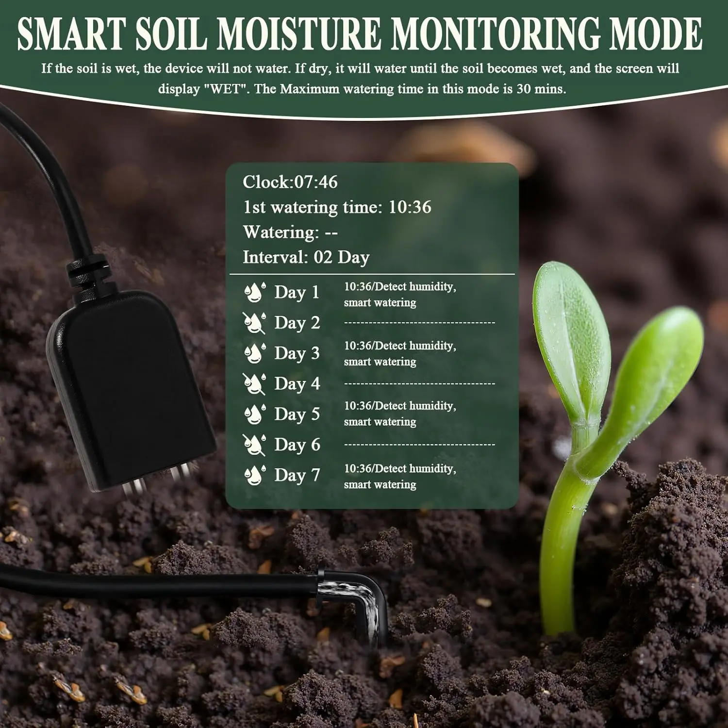 ·Smart Soil Moisture Monitoring Mode: Moisture monitoring mode automatically detects real‑time soil humidity, waters plants only when necessary, prevents overwatering and underwatering, and provides precise, intelligent care for healthier growth