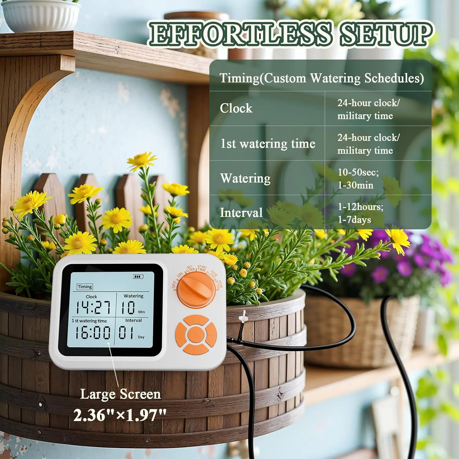 ·Automatic Plant Watering System: Once programmed, It automatically delivers precise hydration to your plants, keeping your garden lush and vibrant. Enjoy worry-free travels and precious happy moments with your loved ones