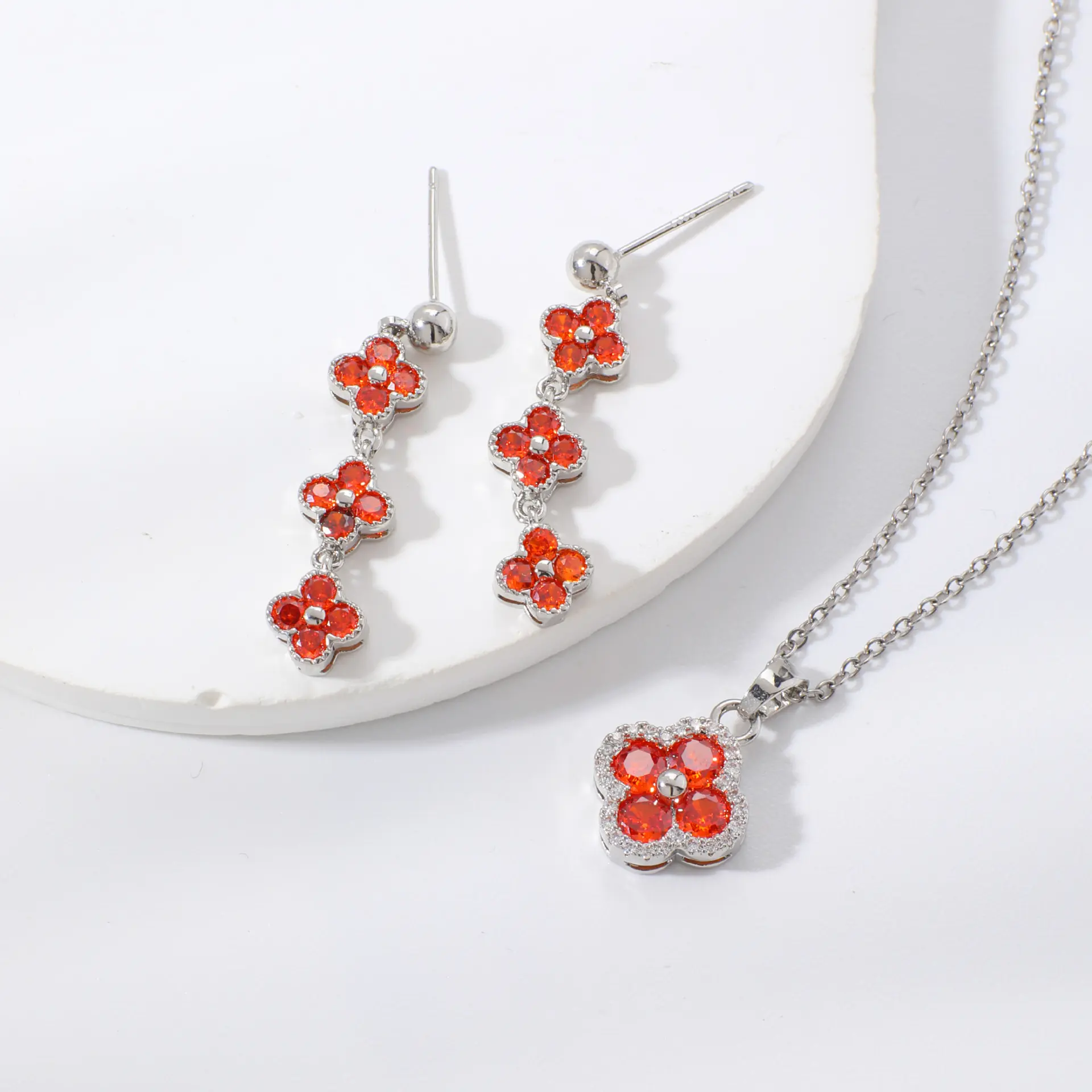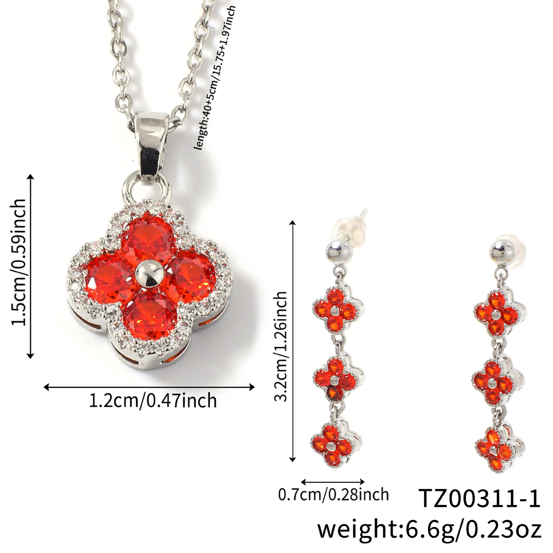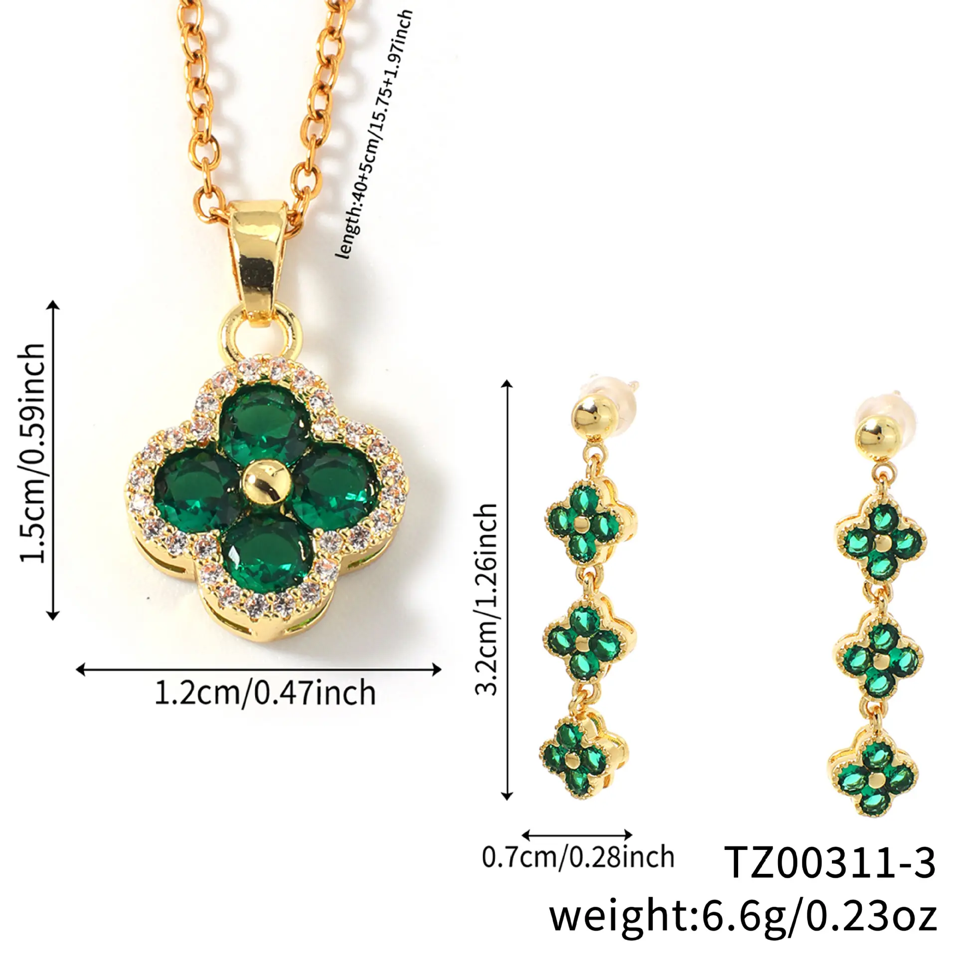 Colorful Lucky Clover Flower Elegant Fashion Copper Inlaid Zircon Earrings Necklace Jewelry Set