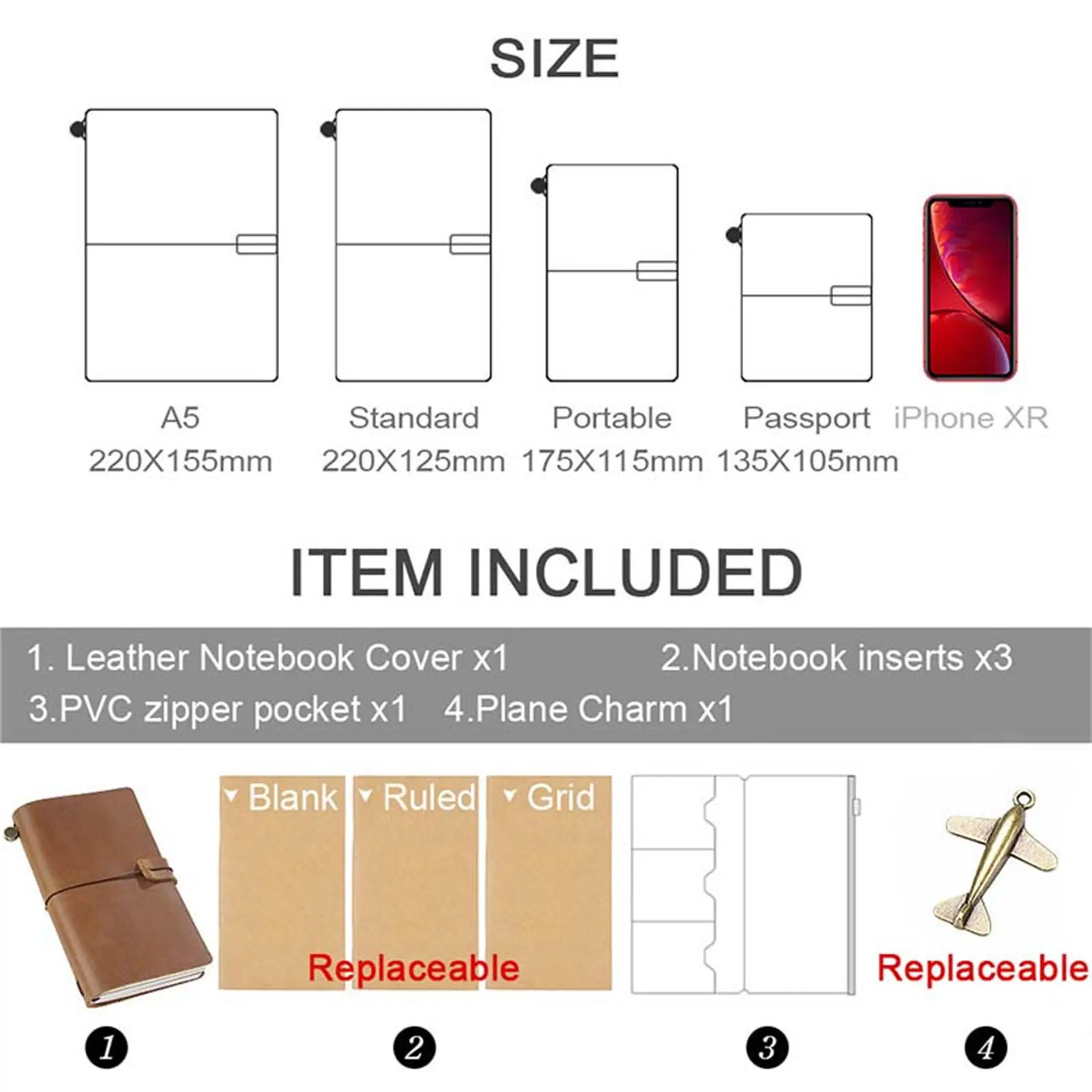 1. Leather Notebook Cover x1 2. Notebook inserts x3 ( Blank, Ruled, Grid ) 3. PVC zipper pocket x1 4. Plane Charm x1 ( You can leave us message to change it, we have 20 types)