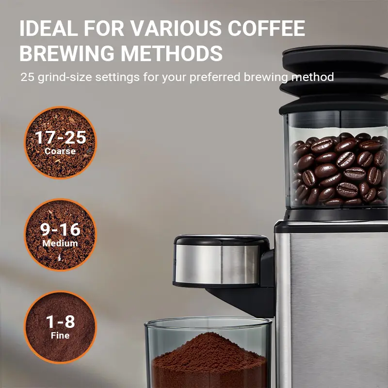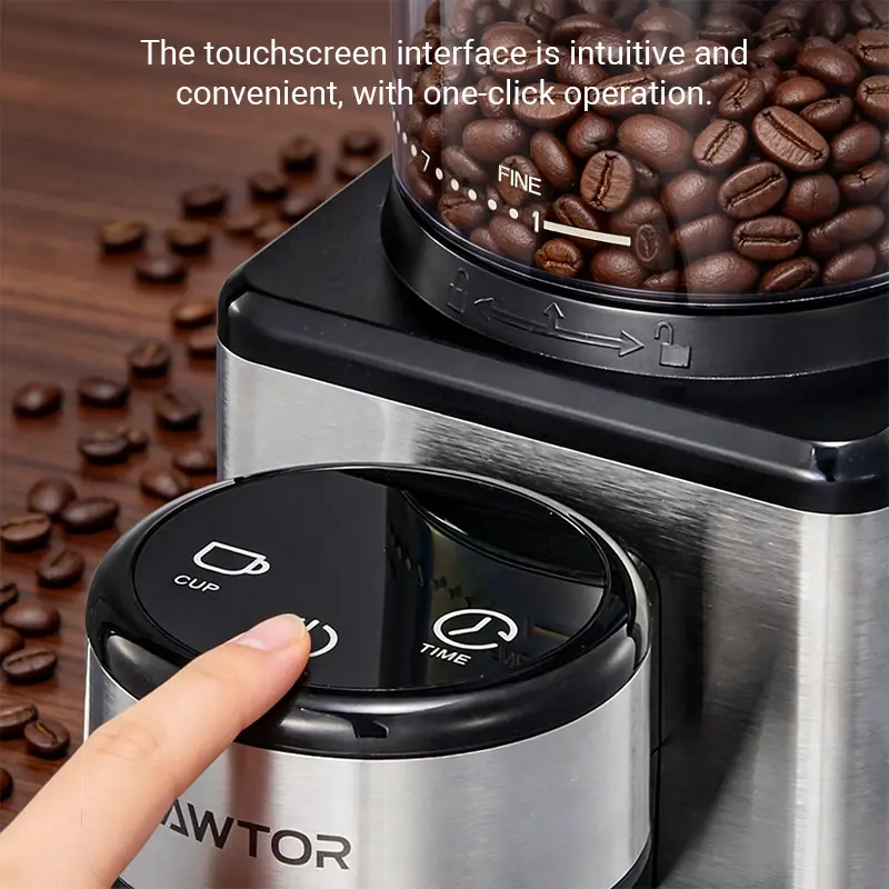 Discover the Conical Burr Coffee Touch Edition ElectricCoffee Bean. This compact machine offers 25 settings for your perfect brew. It features a precision timer for accurate control. The anti-static design ensures a clean, efficient grind. With an air blower, it maintains optimal bean temperature. Ideal for coffee enthusiasts.