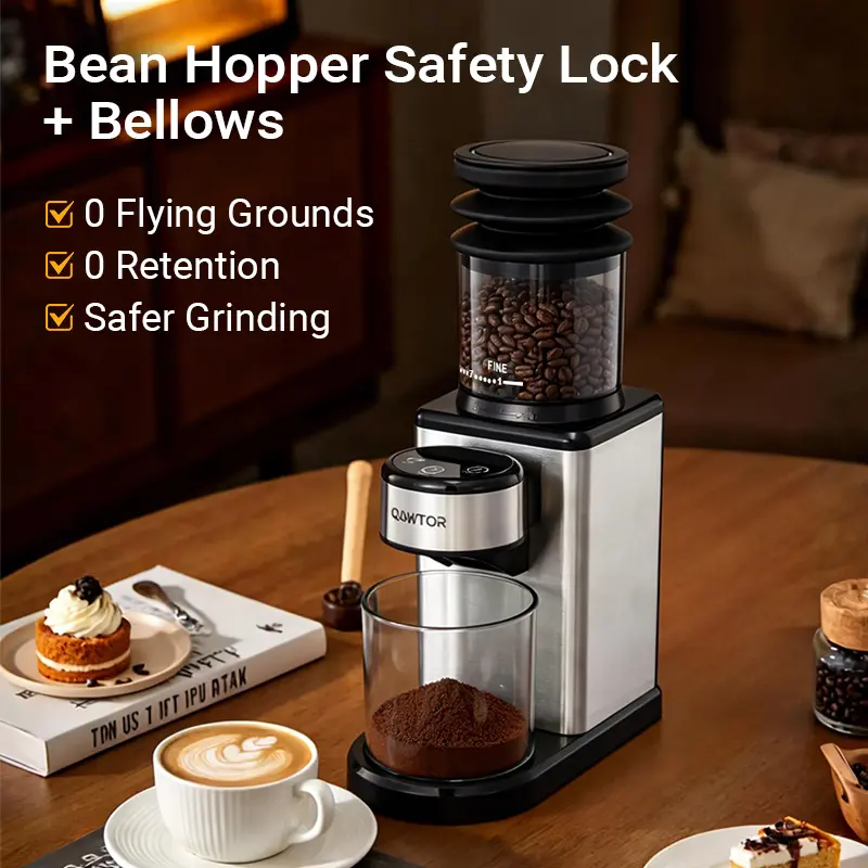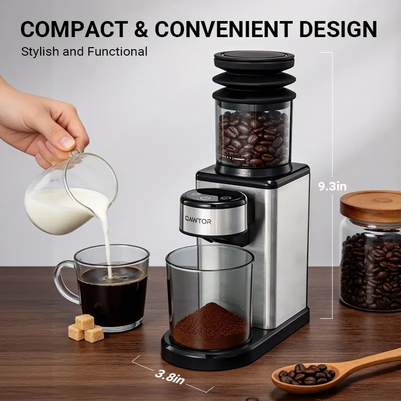 Qawtor Conical Burr Coffee Touch Edition ElectricCoffee Bean - 25 Settings, Precision Timer,Anti-Static, Compact with Air Blower, 200W