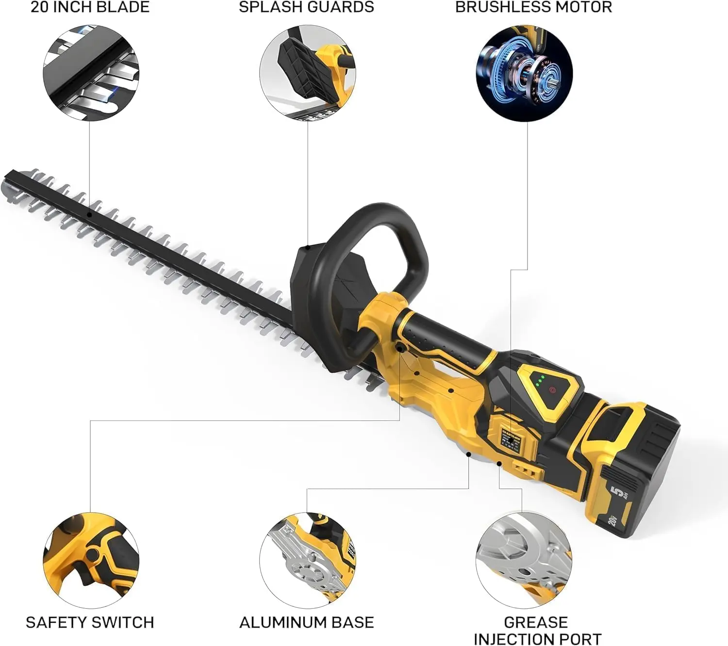 ·【Compatibility with Dewalt 20V MAX Battery】The Pruning Hedge Trimmer Compatibility with Dewalt 20V MAX Battery, Plug in your own battery and get your job done fast and easy! Low-voltage protection is our first concern. The machine will automatically shut down if the battery voltage is below 14.4v to prevent any overload damage.