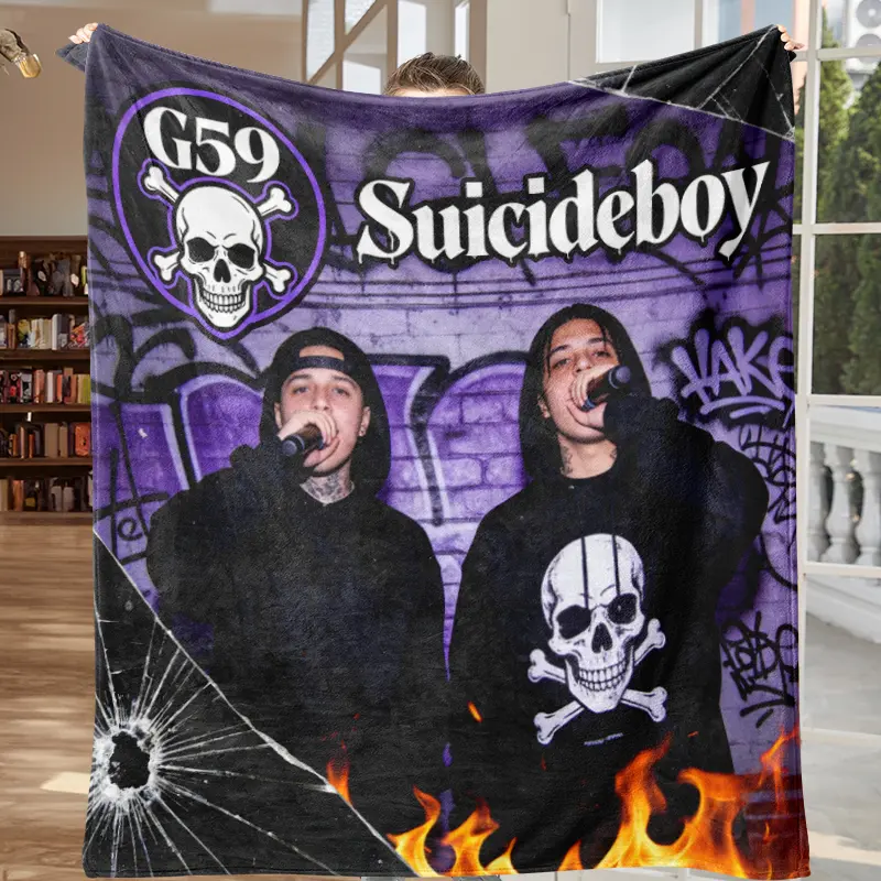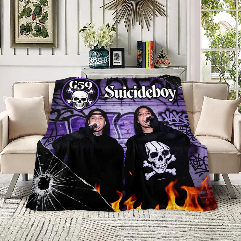🖤This ultra-soft fleece blanket features all of uicideboy's most iconic symbols: the classic G59 logo, $B hand gesture, pentagram, skulls, the iconic devil cartoon, "All But 6" emblem, and the band's signature graffiti-style artwork, all in a bold black-and-white design that perfectly captures the duo's underground rap aesthetic.