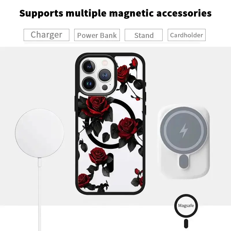 5. Elegant Red Roses Pattern Magnetic Phone Case Shockproof Non Slip Protection TPU Transparent Acrylic Cover Cellphone Protective Supports Wireless Charging Smartphone for iPhone 17 15 16 14 Pro Max 13 12 Air Plus