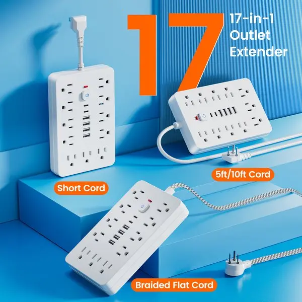 17-in-1 USB Power Strip – 11 Outlets + 6 USB (2 USB-C) | Surge Protector | Extension Cord (5FT/10FT)