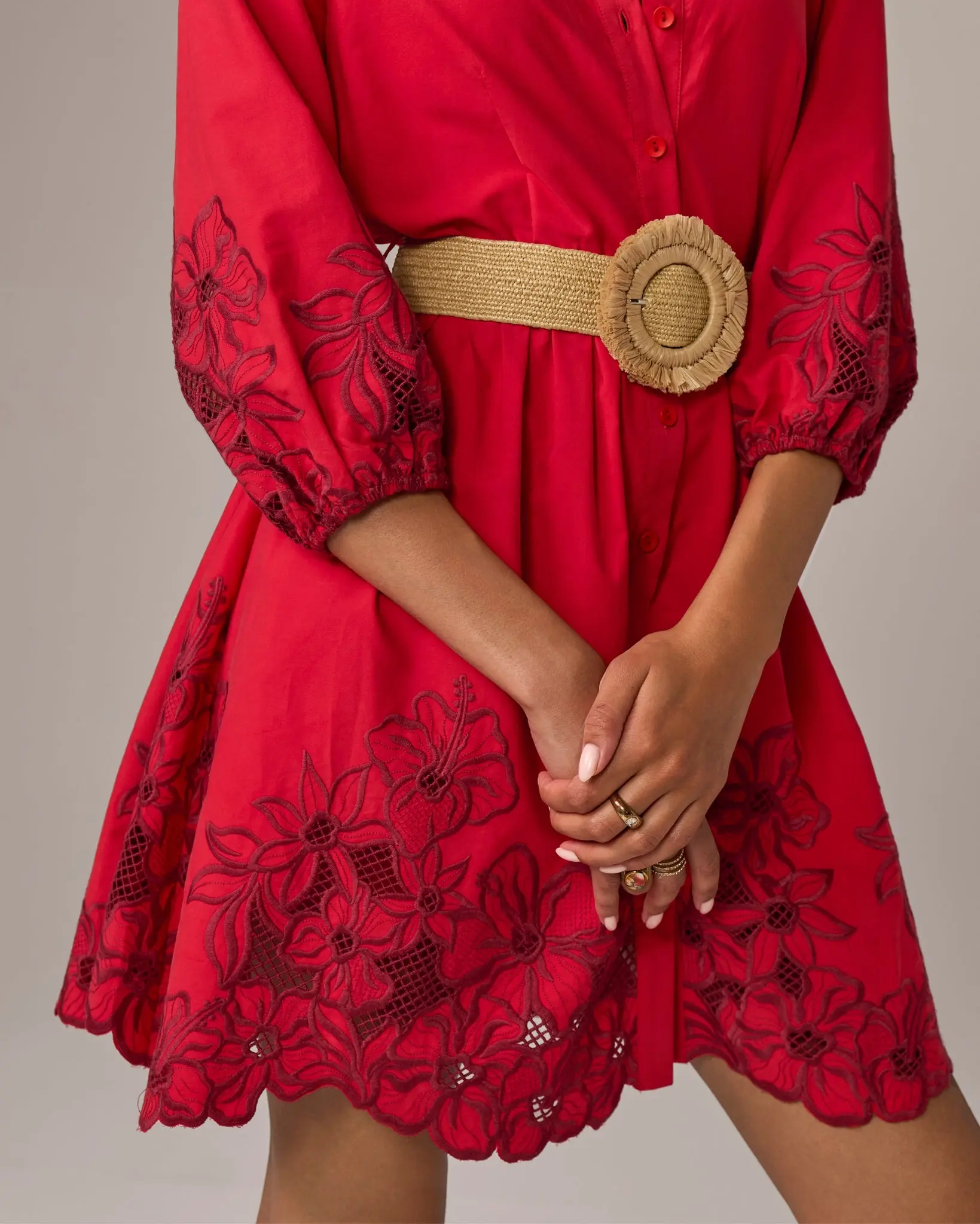 The Raffia Belt with Frayed Buckle adds bold texture and sculptural detail to your outfit. The woven raffia strap sits comfortably at the waist, offering natural structure that works beautifully over dresses or lightweight layers. A statement circular buckle wrapped in raffia is finished with softly frayed edges, creating a dimensional centerpiece that draws the eye. Slip it on to instantly add shape, texture, and personality to your look.