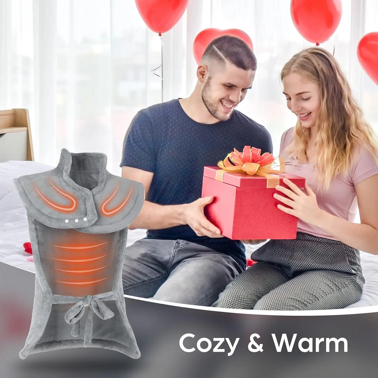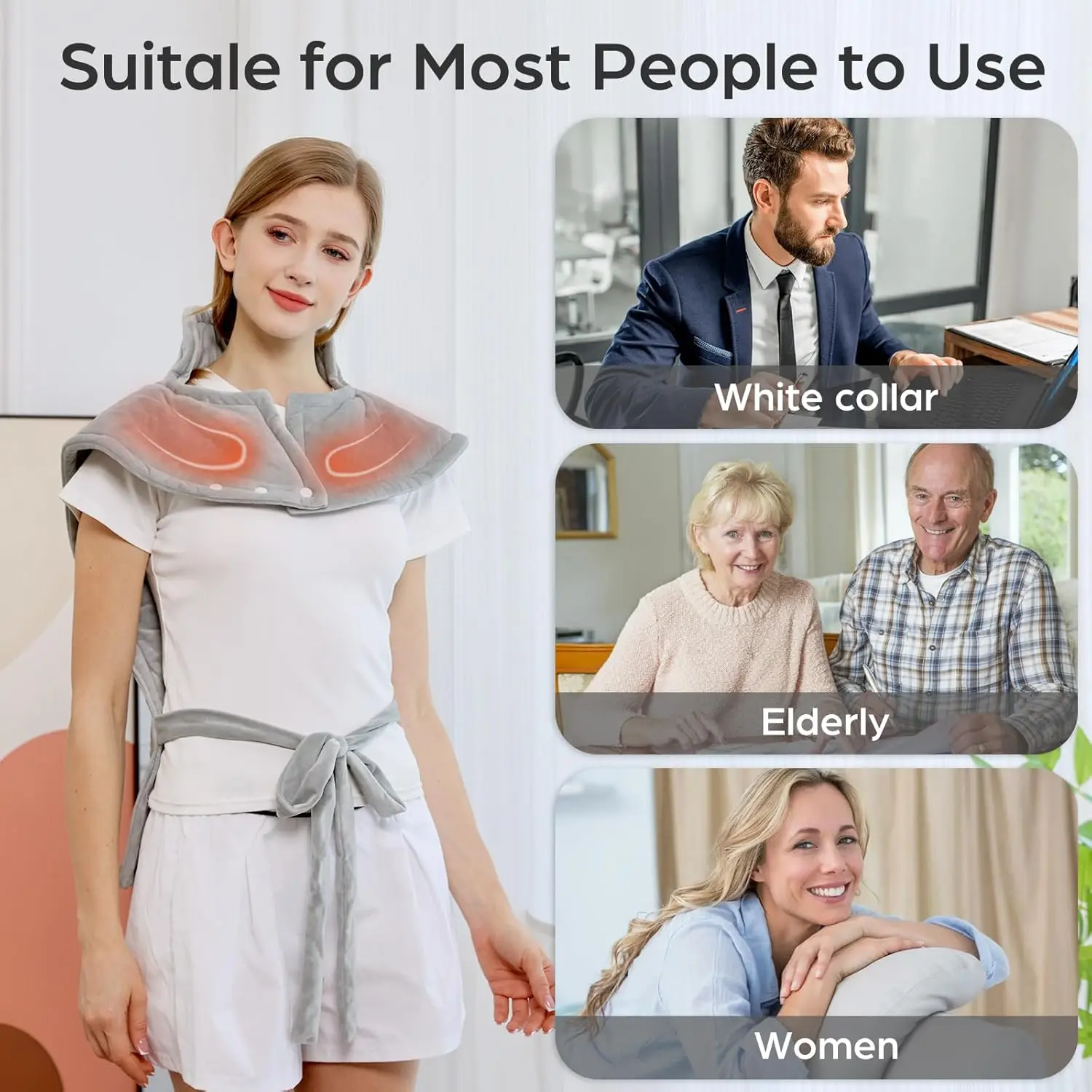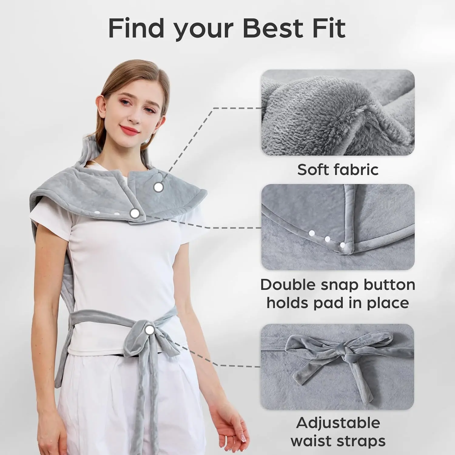 6 Heating Levels & 4 Auto-off Timers: Tailor your heat therapy with 6 Heating Levels settings to find just the right level of warmth. The heating pad for back controller features a clear display for easy operation, allowing you to easily adjust the 6-level temperature settings and 30, 60, 90 or 120-min timer settings. Overheat protection and automatic shut-off feature make our heating pad safer to use. 24"x 36" Heating Pad - Pain and Cold Relief: Designed with a generous 24"x 36" size, this wearable extra large heating pad provides targeted warmth for your neck, shoulders, back, and waist, provide heat for natural pain relief and relaxation. Whether you are at home, working in the office or after a workout at the gym, you can use this back heating pad to relax your sore neck, shoulders and back. extended straps & 3 adjustable buckles: As a heating pad for neck and shoulders and back, we use snap and strap design to allow the shoulder heating pad to wrap around your body and keep you warm without slipping or getting loose. The extended straps fit a wider range of body types, you can adjust the snaps and straps to fit your needs and wear it while working or reading. Skin-friendly Fabrics and Washable: This electric heating pad is designed using super-soft, skin-friendly plush, ensuring a cozy and comfortable experience during use. Easy maintenance simply detach the controller and toss it in the washing machine. Built to last, this heated pad stay soft, cozy, and comfortable, even after repeated washes.Its the perfect choice of back heating pad for back pain.