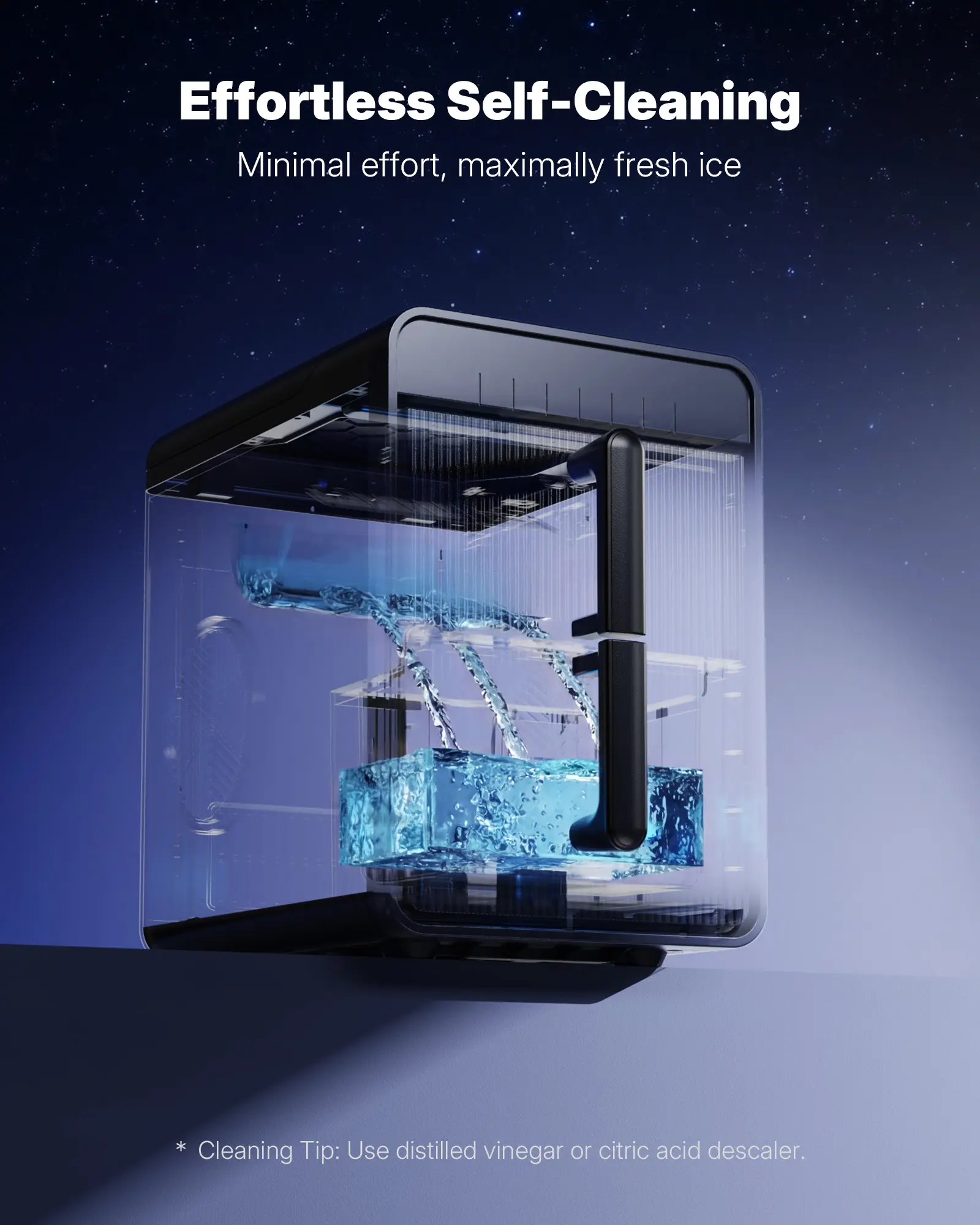 ·Self-cleaning mode: One-touch 30-minute cleaning cycle for pure, fresh ice without manual maintenance.