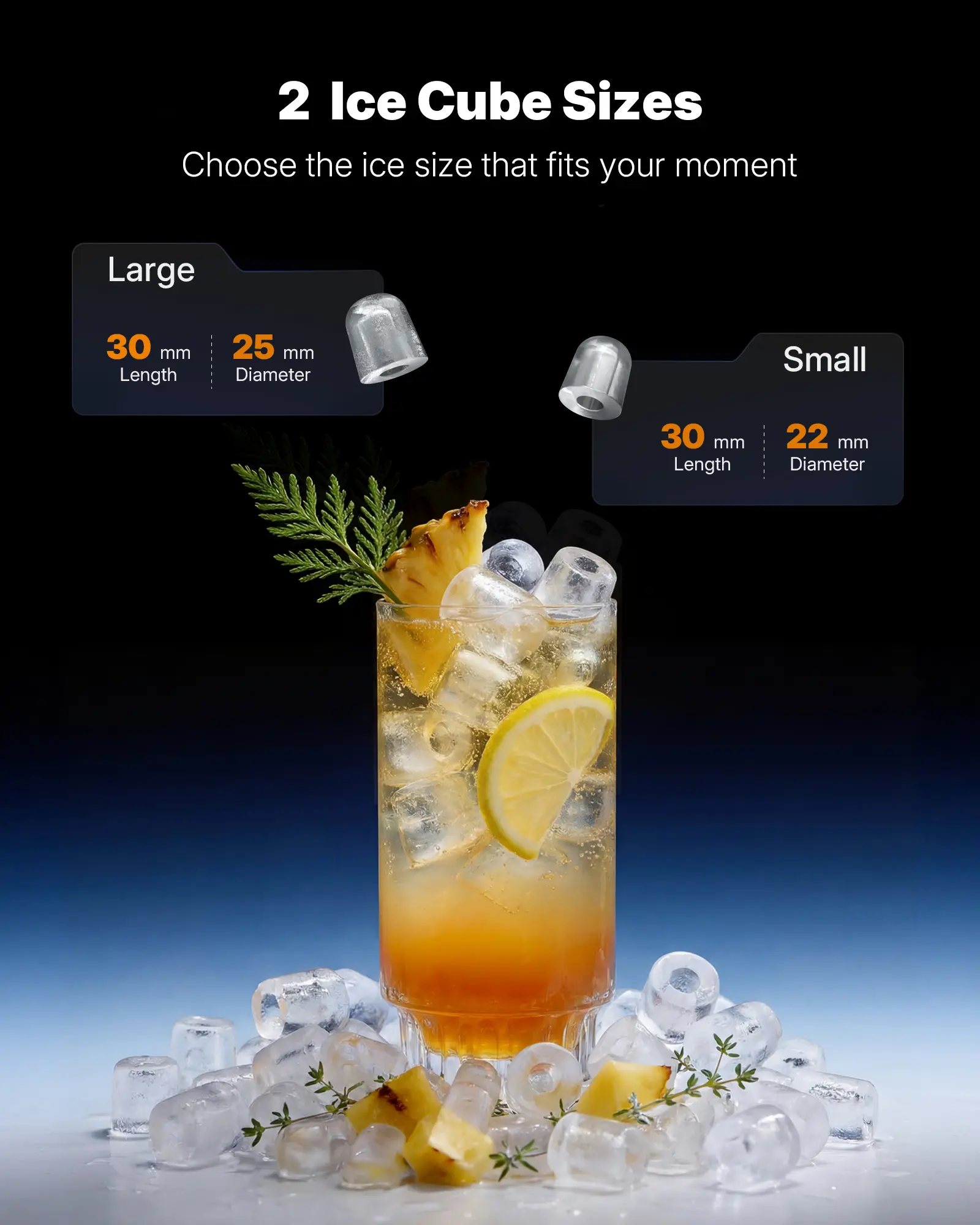 ·Two ice sizes: Choose between two hollow cone sizes for cocktails, soft drinks, or daily hydration.