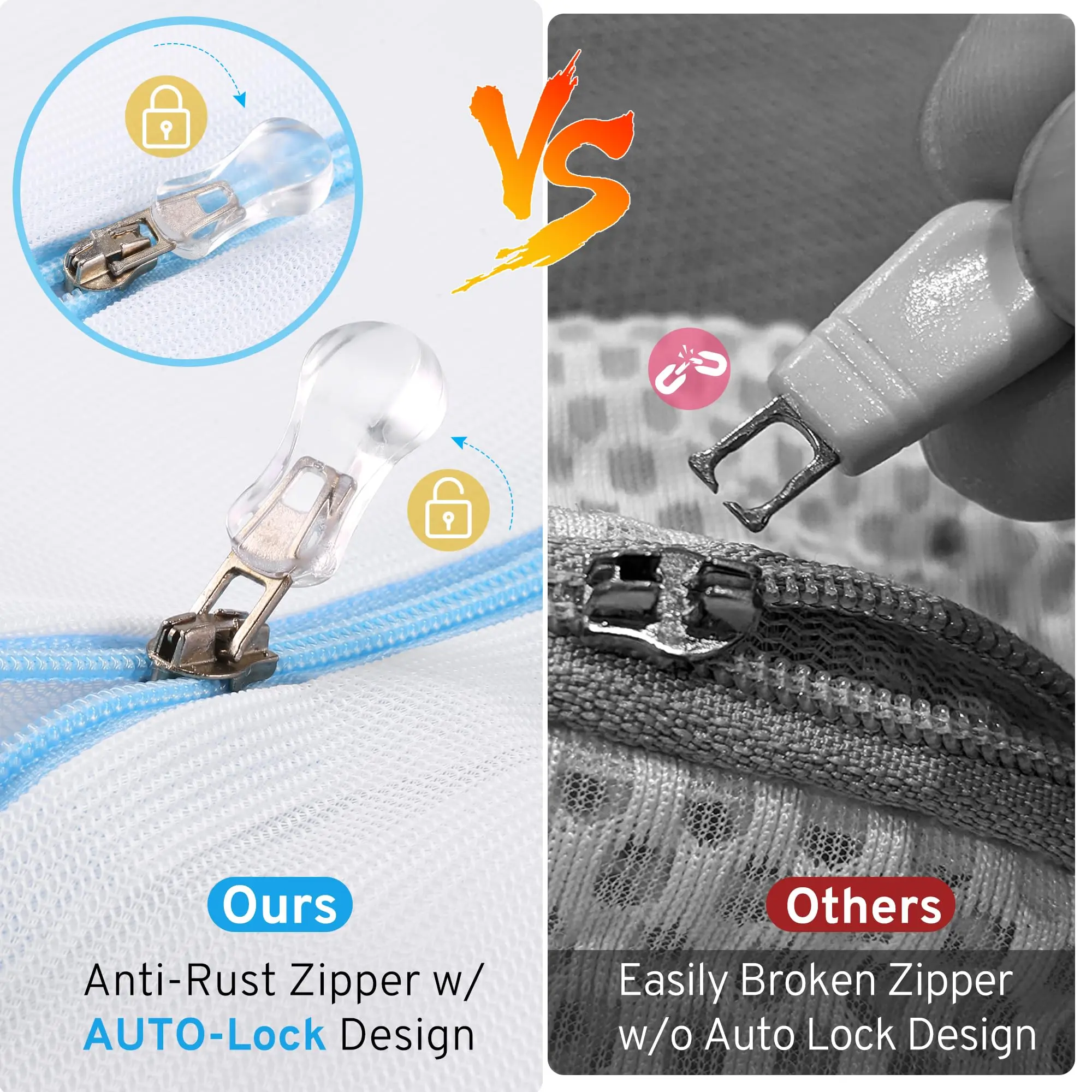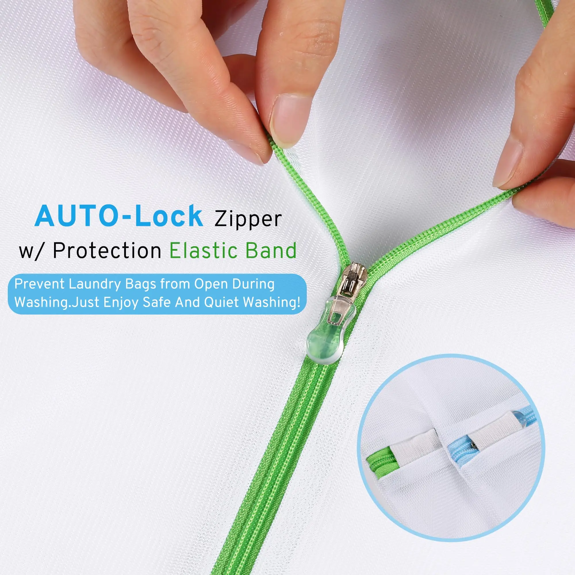 Equipped with a premium AUTO-Lock zipper and protective elastic band, these bags ensure your garments stay secure. The rust-resistant, smooth zipper and elastic band provide a quieter, snag-free laundry experience. Protect your delicates from tangling and pilling, extending their lifespan and saving you money.