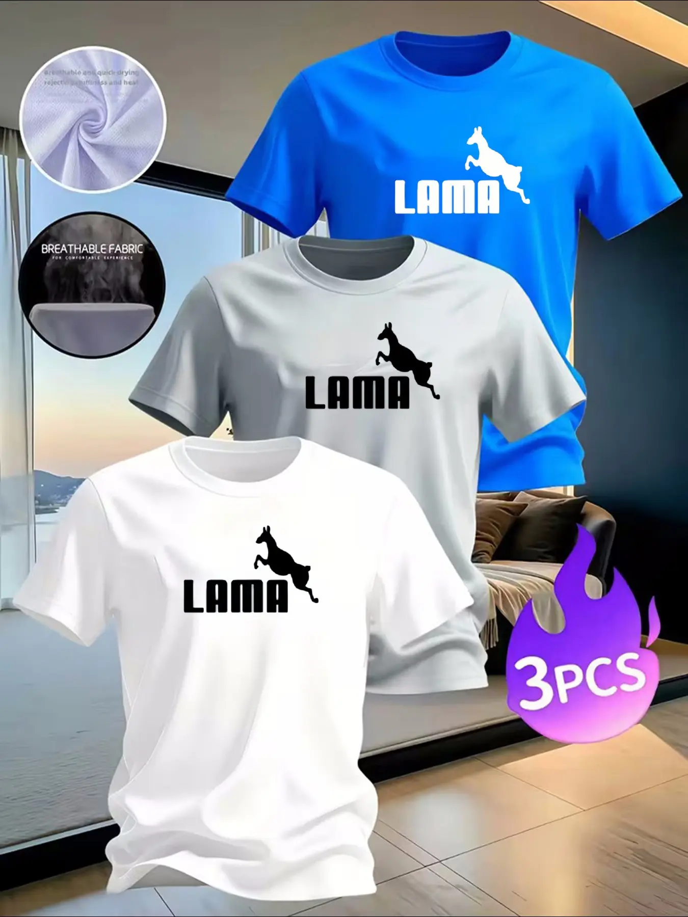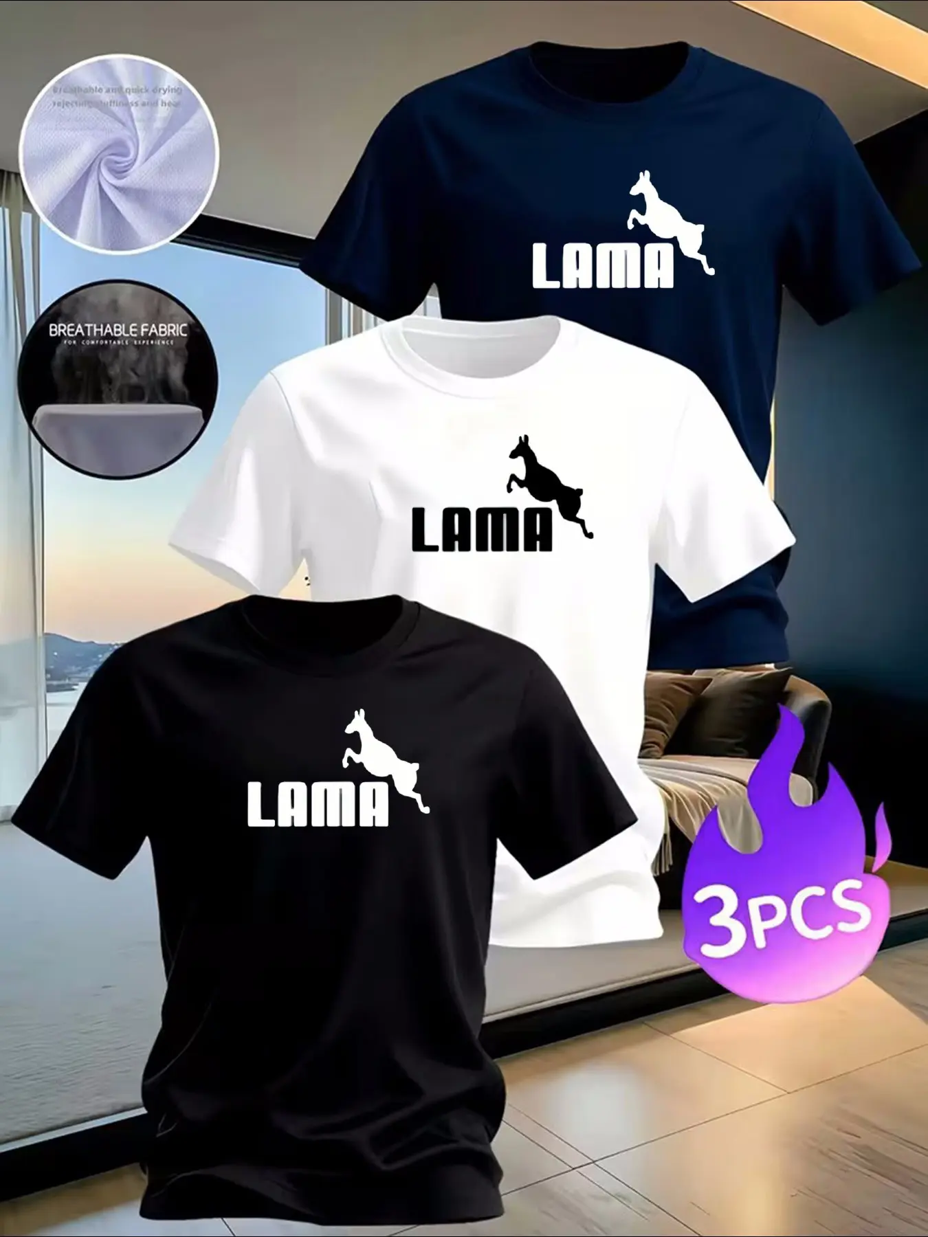 3-Pack Men's "LAMA" Animal Graphic T-Shirts - Casual Breathable Quick-Dry Tees for Daily & Streetwear