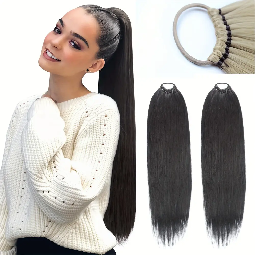This 24 inch long straight ponytail extension features a elastic band wrap around design, offering an easy-to-apply, versatile hair solution. Made from high-quality synthetic fiber, this ponytail can be worn as a classic ponytail or braided for different styles. Perfect for women who want to add instant length, volume, and versatility to their natural hair.