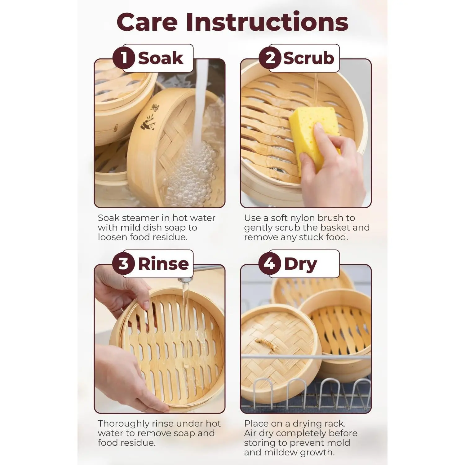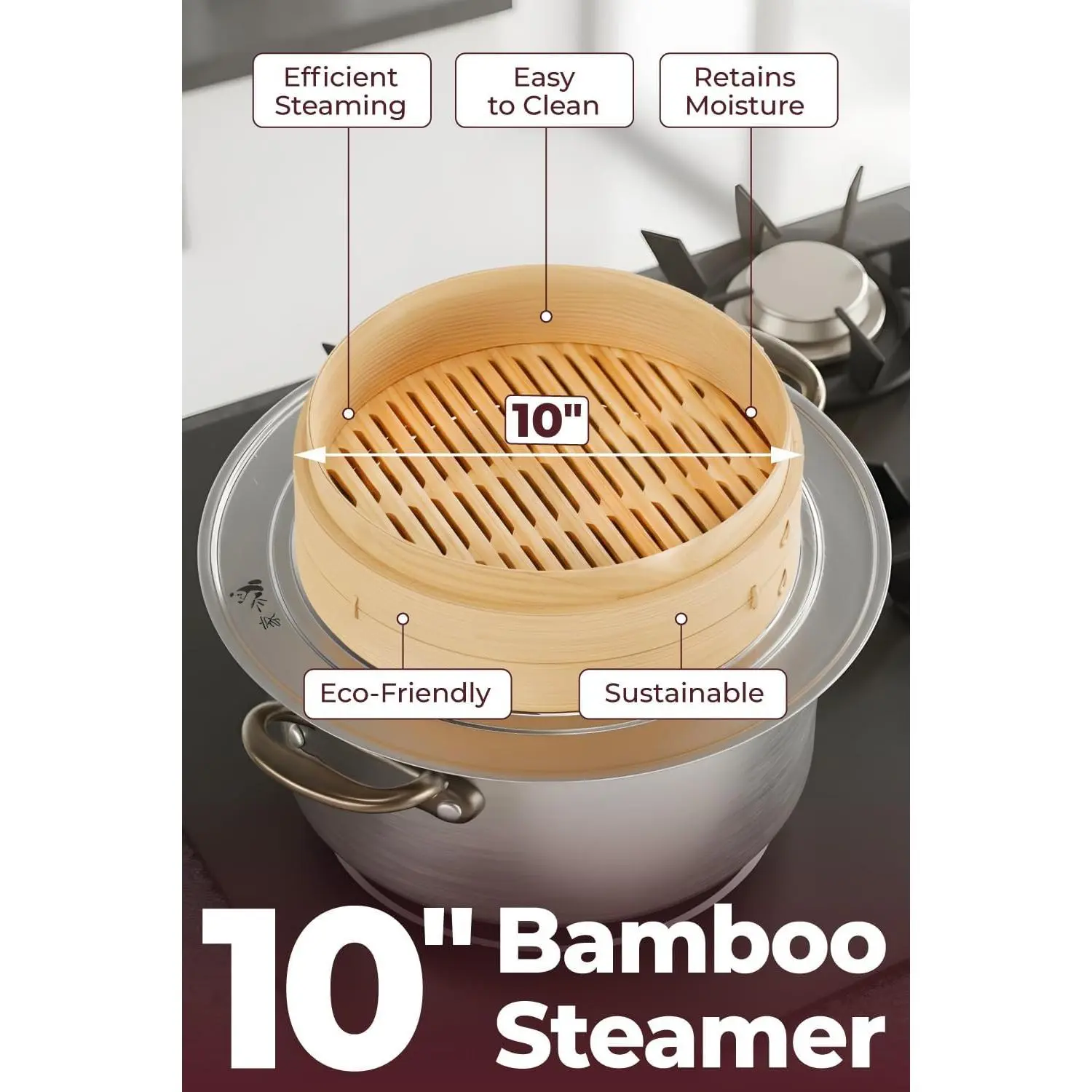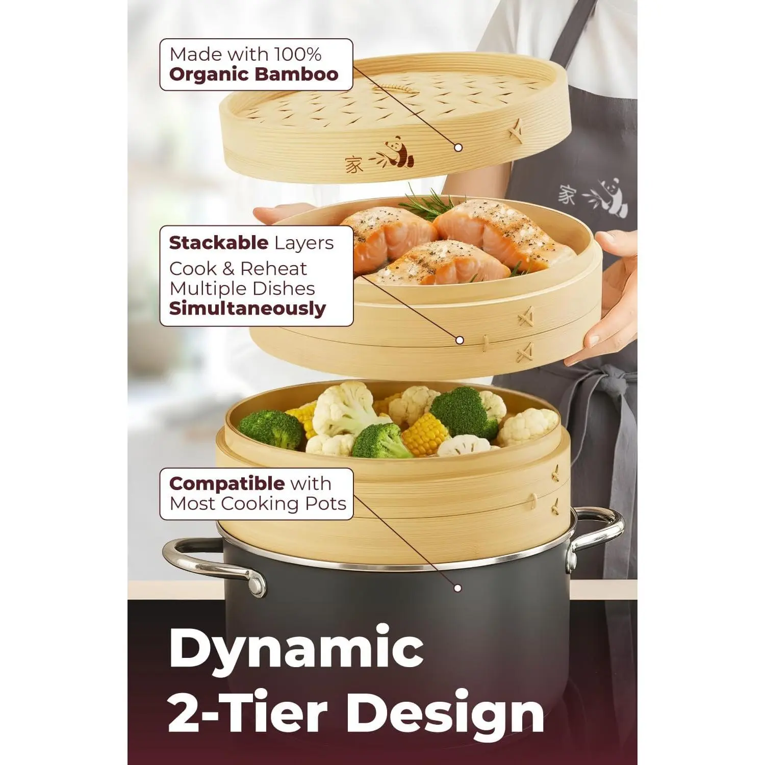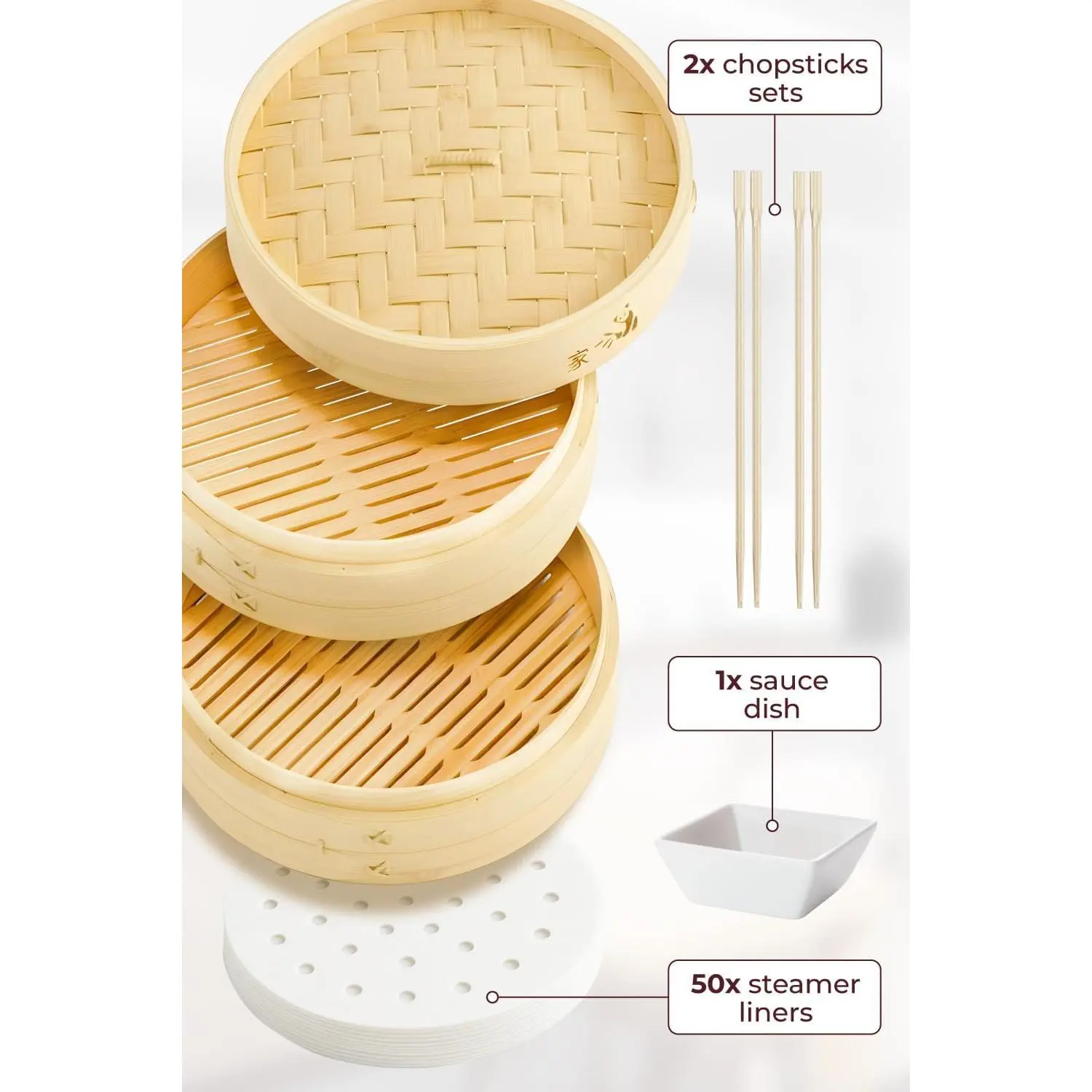 Bamboo Steamer Basket 10-Inch | 2-Tier Steamer for Cooking | 50 Liners, Chopsticks, Sauce Dish | Steaming Asian Food, Bao Buns, Chinese, Dim Sum, Dumpling, Rice, Vegetable Steam Pot