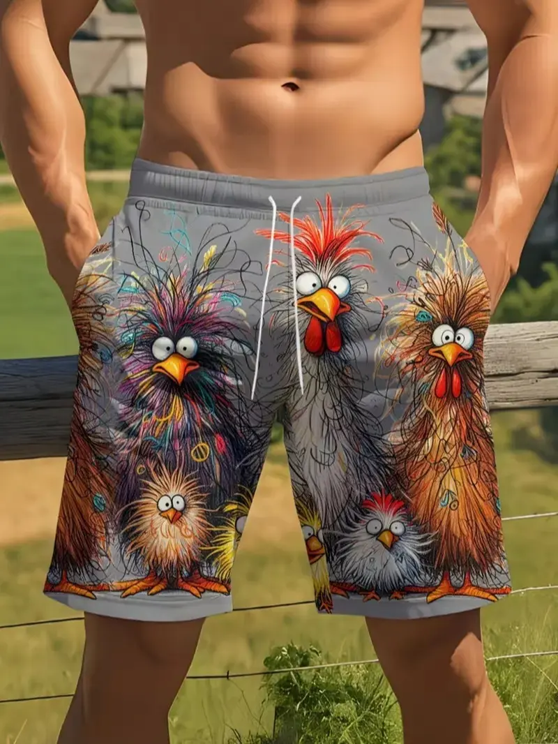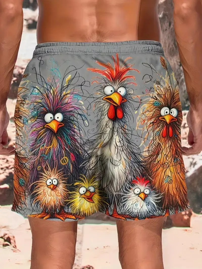 Elevate your beach style with these sporty swim trunks featuring a vibrant 3D chicken print. Perfect for casual beachwear, these shorts add a fun twist to your summer wardrobe. Ideal for surf and dive activities, they combine functionality with fashion.