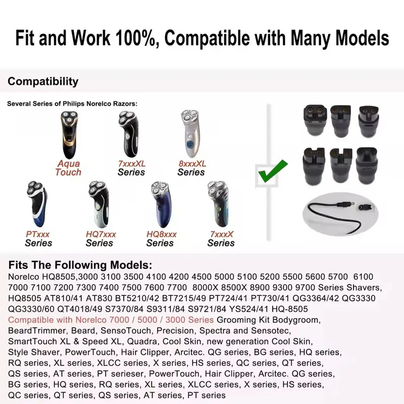 Compatible with Norelco 7000/5000/3000 Series, QT series, QS series, AT series, PT series, QG series, BG series, HQ series, RQ series, XL series, XLCC series, X series, HS series, QC series, Grooming Kit Bodygroom, BeardTrimmer, Beard, SensoTouch, Precision, Spectra and Sensotec, SmartTouch XL & Speed XL, Quadra, Cool Skin, new generation Cool Skin, Style Shaver, PowerTouch,Suker Hair Clipper, Arcitec