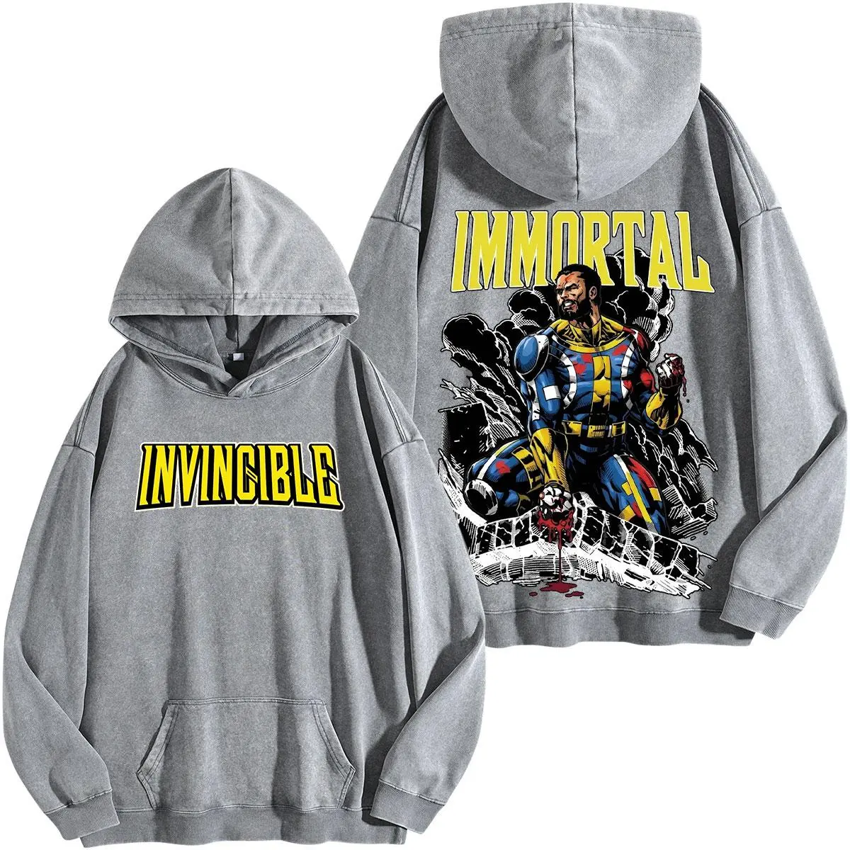 Invincible Immortal Superhero Graphic Washed Hoodie | Vintage Washed Oversized Heavyweight T Shirt | Comic Streetwear Shirt Large Back Print | Heavy Cotton Unisex | Gym Pump Cover Gamer Outfit