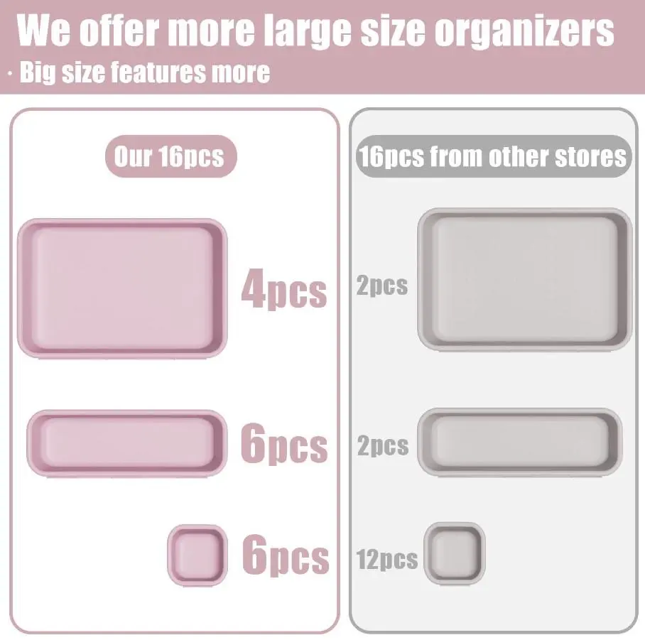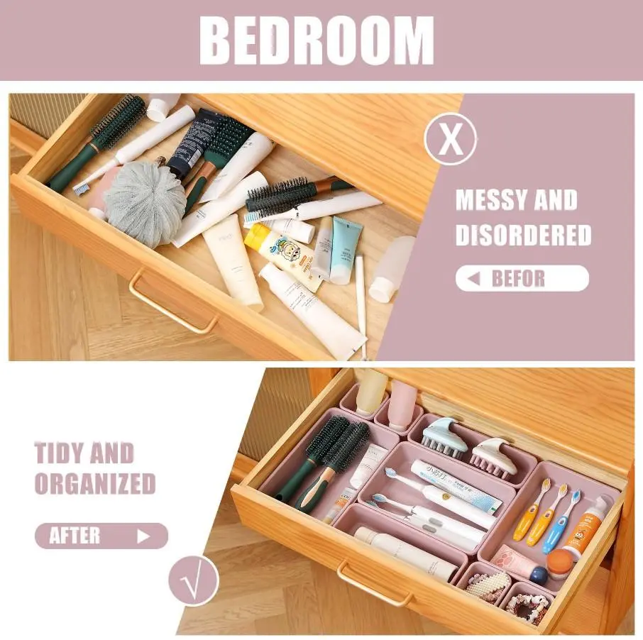 This versatile set includes 3 sizes of plastic storage trays. Perfect for organizing makeup, jewelry, utensils, kitchen items, bathroom essentials, and office desk clutter. The set features drawer dividers that fit seamlessly into various spaces. Keep your belongings tidy and accessible.