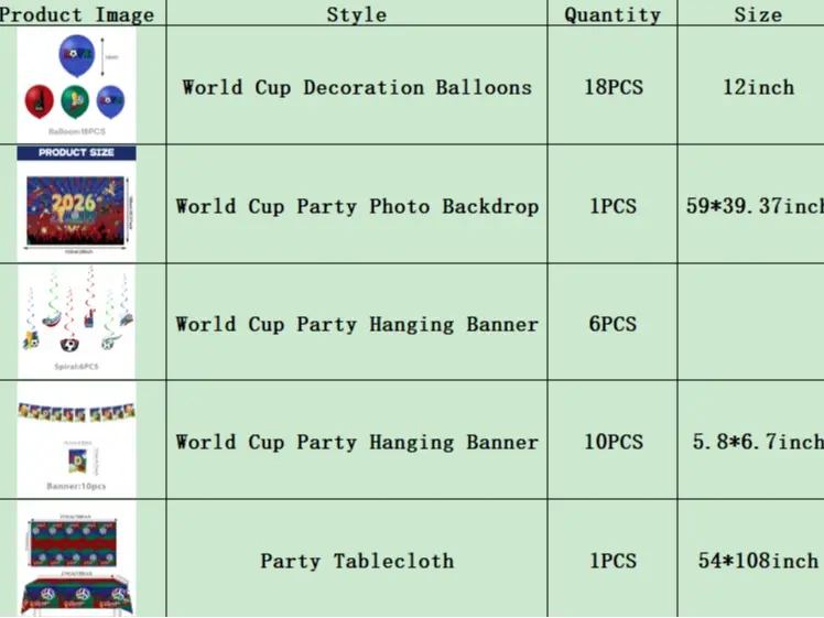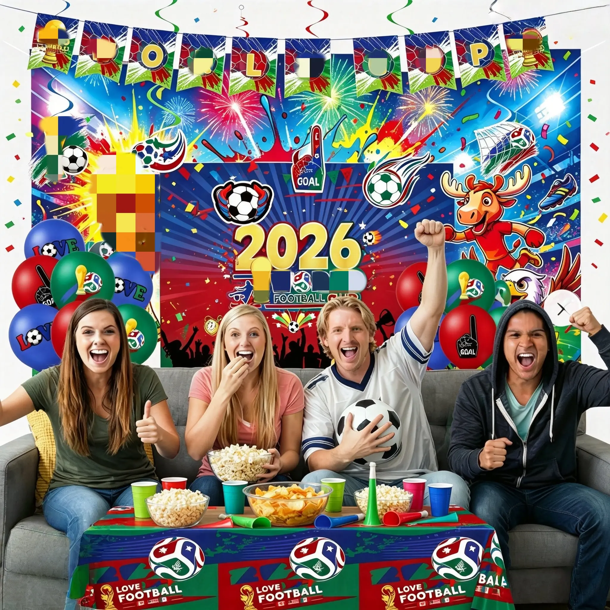Get ready for the 2026 with this complete football party decoration set! Perfect for fans gathering, indoor or outdoor celebrations, and creating an exciting World Cup atmosphere. This all-in-one set includes balloons, banners, a backdrop, and a tablecloth to make your party memorable. Ideal for USA, Canada, and Mexico fans to celebrate the biggest football event of the year.