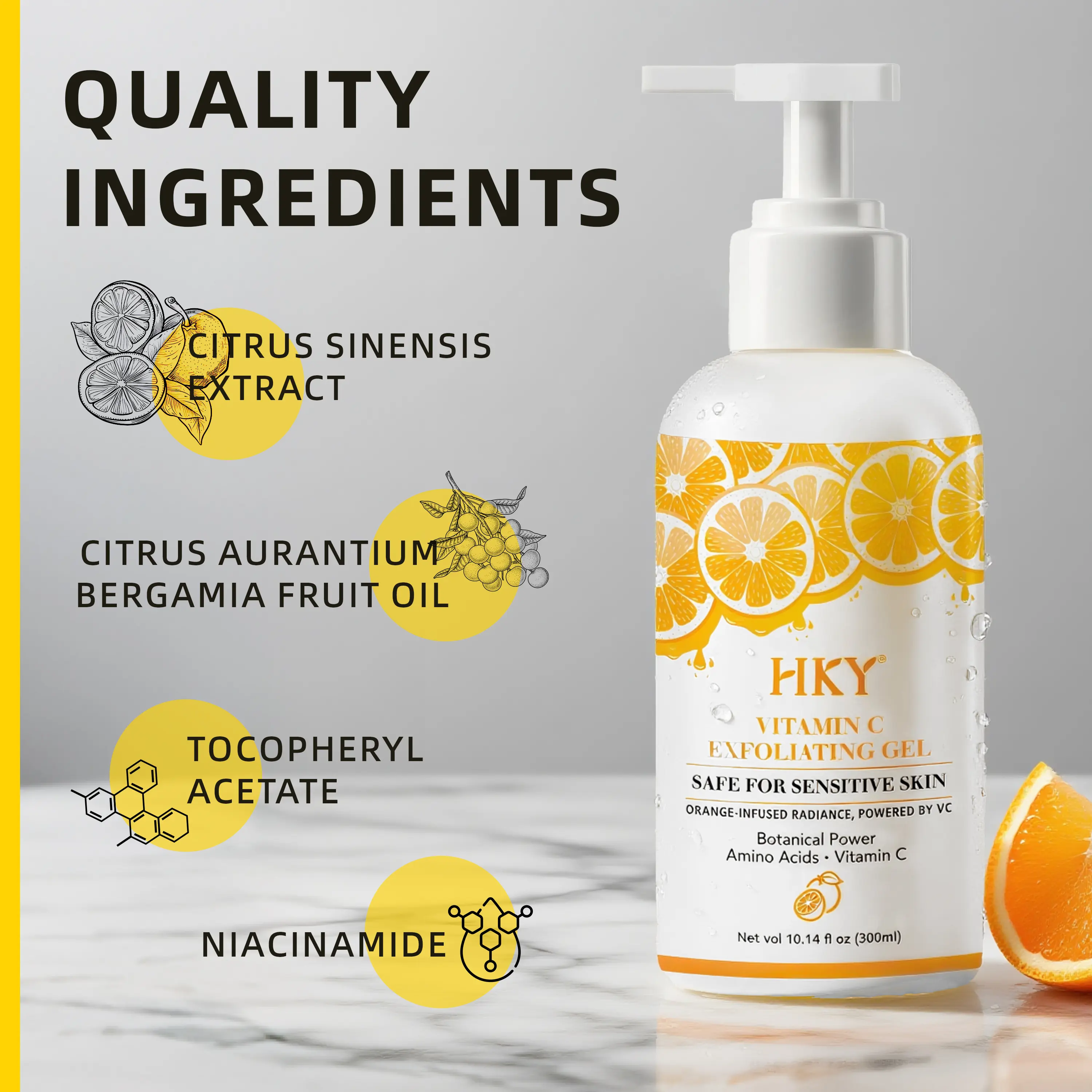 | Ingredients | Water (Aqua),Glycerin,Carbomer,Propanediol,Citrus Sinensis Extract,Cetrimonium Chloride,Hydrated Silica,Hydrolyzed Corn Starch,Alcohol,Citrus Aurantium Bergamia (Bergamot) Fruit Oil,Phenoxyethanol,Methylparaben,Ethylhexylglycerin,Tocopheryl Acetate,Niacinamide,3-O-Ethyl Ascorbic Acid,Salicylic Acid,Acacia Senegal Gum,Butylene Glycol,Bletilla Striata Root Extract,Serine,Arginine,Glutamic Acid,Isoleucine,Proline,Glycine,Leucine,Alanine,Aspartic Acid,Dendrobium Officinale Stem Extract,Chlorella Vulgaris Extract,Valine,Citrus Grandis (Grapefruit) Fruit Extract,1,2-Hexanediol,Hydroxyacetophenone,Centella Asiatica Extract,Polygonum Cuspidatum Root Extract,Scutellaria Baicalensis Root Extract,Camellia Sinensis Leaf Extract,Glycyrrhiza Glabra (Licorice) Root Extract,Chamomilla Recutita (Matricaria) Flower Extract,Rosmarinus Officinalis (Rosemary) Leaf Extract,Sodium Lactate,Lactic Acid. |