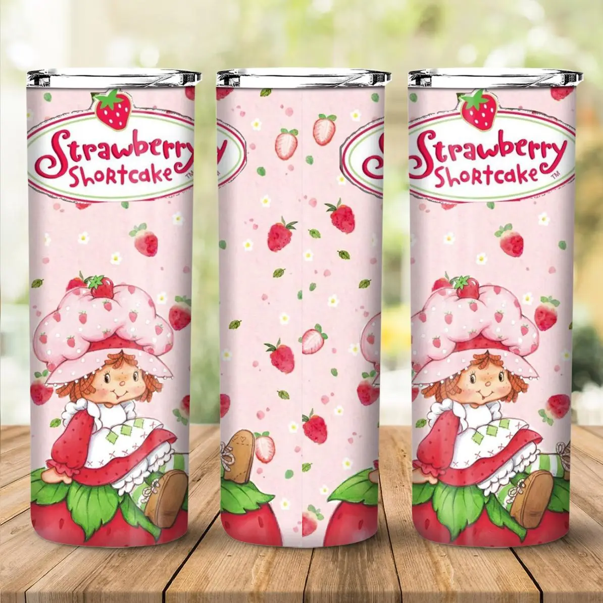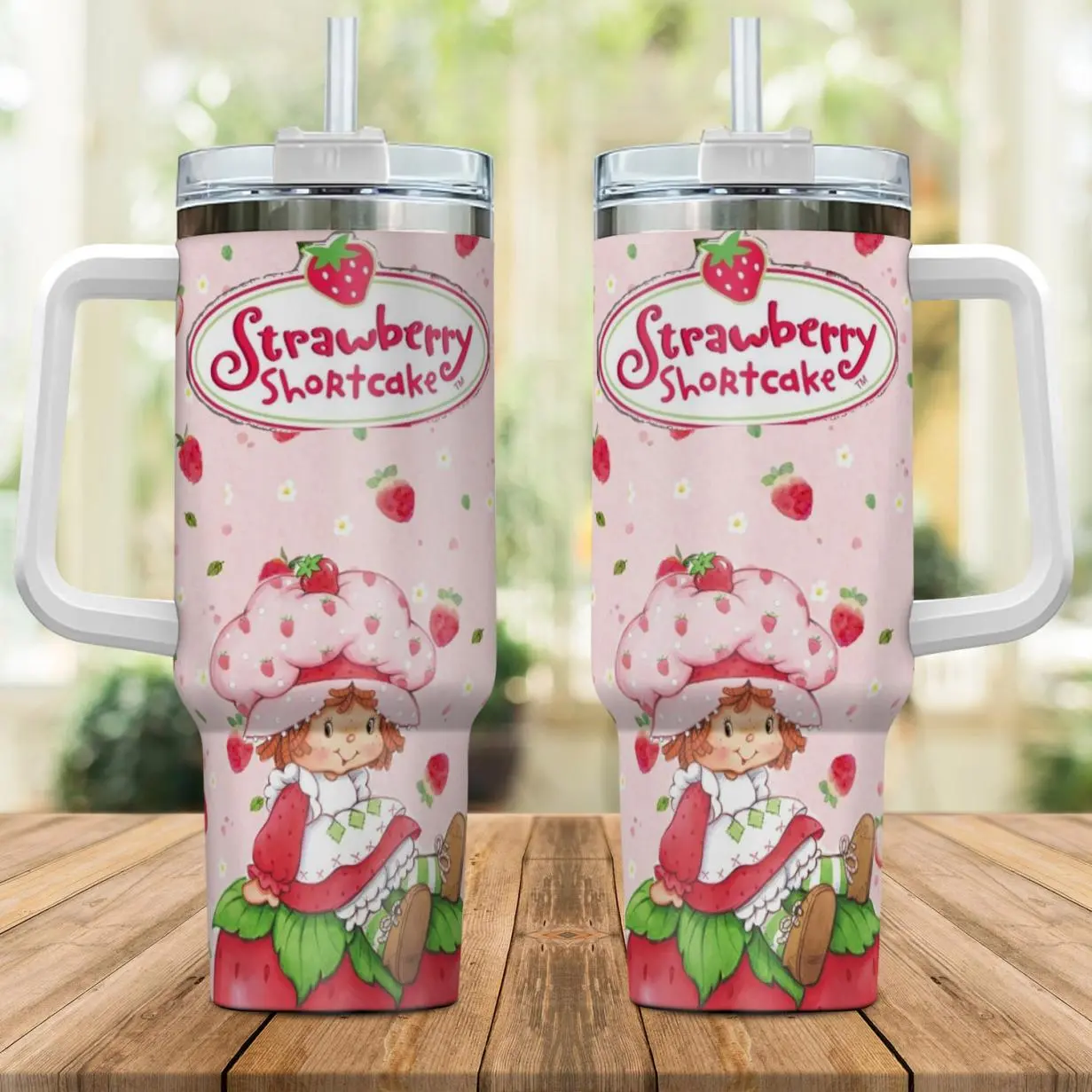 Strawberry Shortcake Tumbler 40oz with Handle, Pink Strawberry Girl Cartoon Design, Cute Insulated Travel Mug with Straw, Gift for Girls