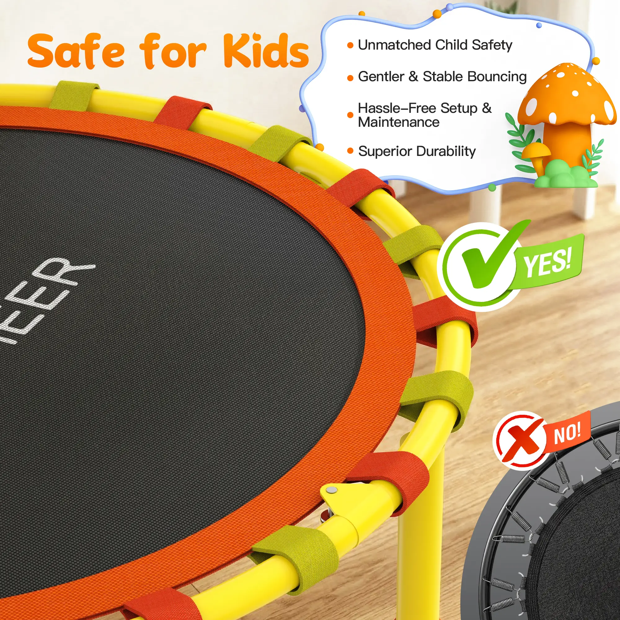 High-elastic silent bungee cords deliver soft, smooth rebounds without harsh squeaks or noise. Kids can jump happily anytime, day or night, without disturbing neighbors or family members—ideal for apartment and home use.