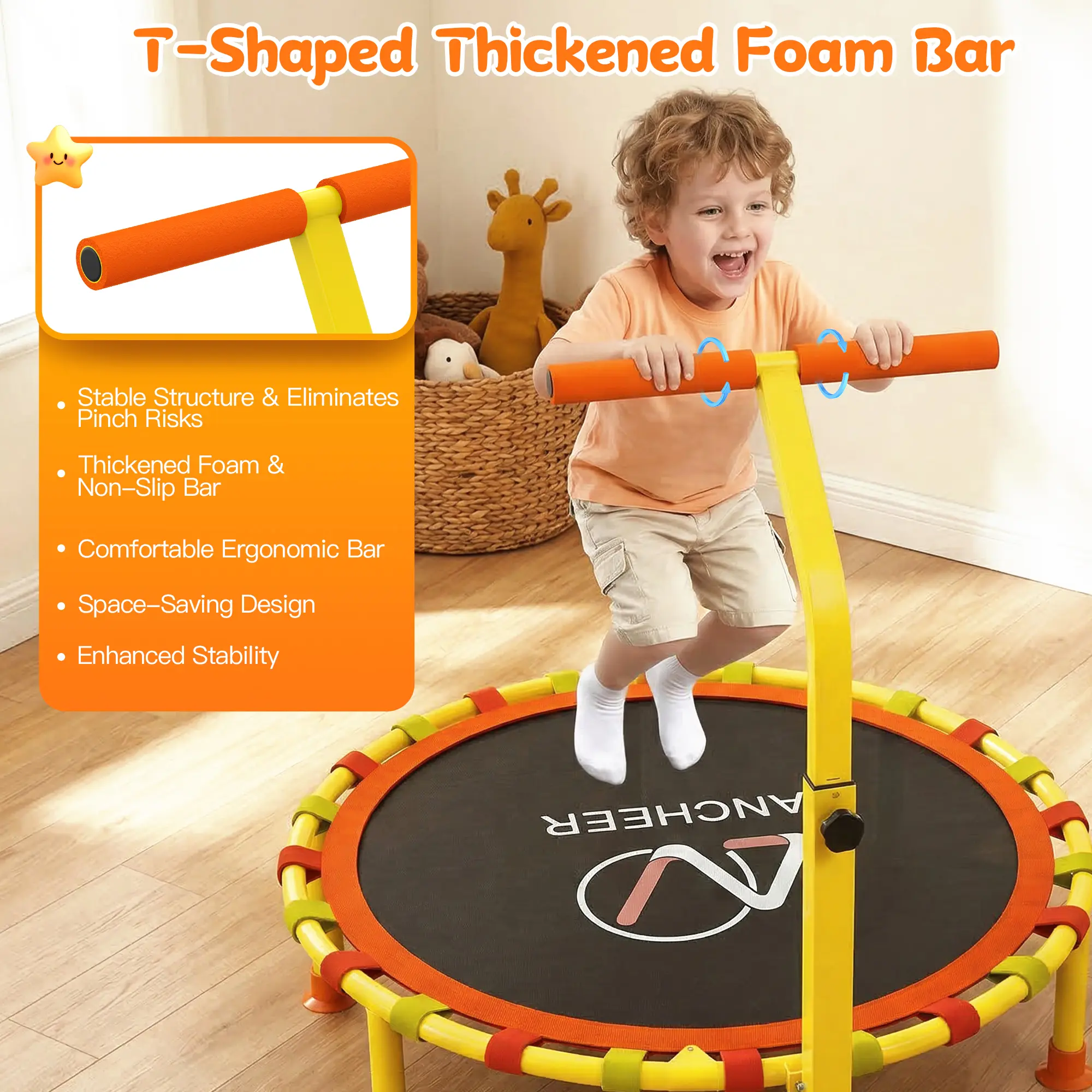 Built with a thickened all-steel frame and non-slip rubber floor feet for zero wobble. The ergonomic thick foam T-handle protects little hands and ensures a secure grip, while the wear-resistant, waterproof PP jumping cloth delivers gentle, joint-friendly rebounds. Every detail is engineered for total safety during play.