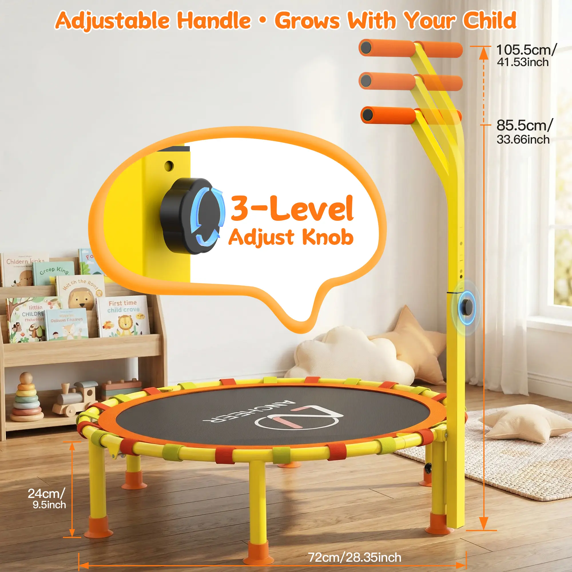 The T-shaped handle features 3 height settings (85.5cm–105.5cm / 33.66''–41.53'') to fit kids of different ages and heights. No need to replace the trampoline as your child grows—this one toy lasts for years, saving you money.