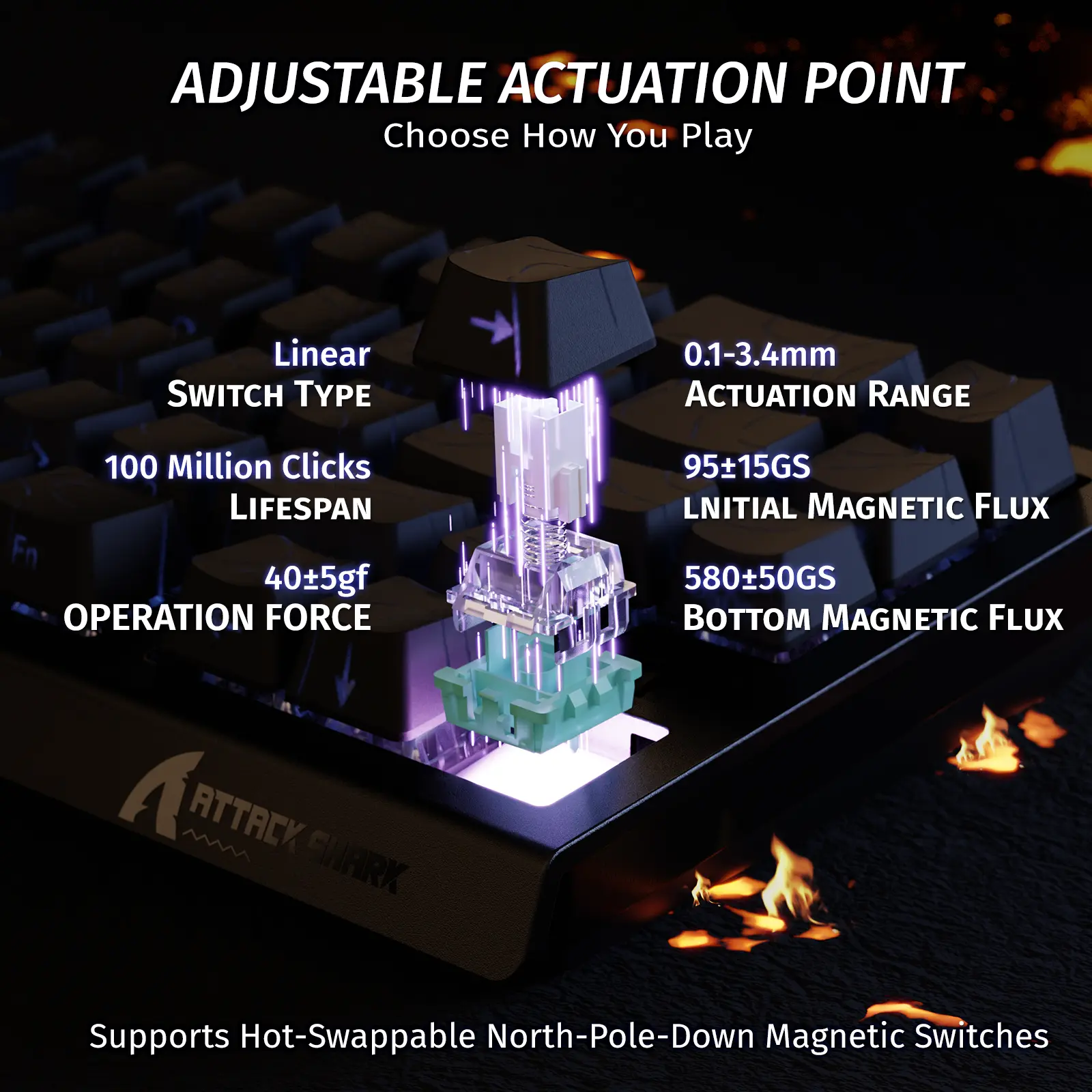 ·【60% Percent Layout Magnetic Switch Keyboard with RT Function】Equipped with adjustable hall effect magnetic switches, featured with customizable dynamic keystroke and rapid trigger function, this ATTACK SHARK X68HE keyboard allow you bind 4 functions according to 4 different pressing degrees to one key, adjust keystroke actuation point from a light 0.1mm to a strong 3.4mm, true 8000Hz polling rates, 0.01mm RT accuracy, effectively reducing keyboard latency to an impressive 0.125ms(theoretical value), ensure flexibility and ultra-response, perfect for FPS and rhythm game like Valorant, osu