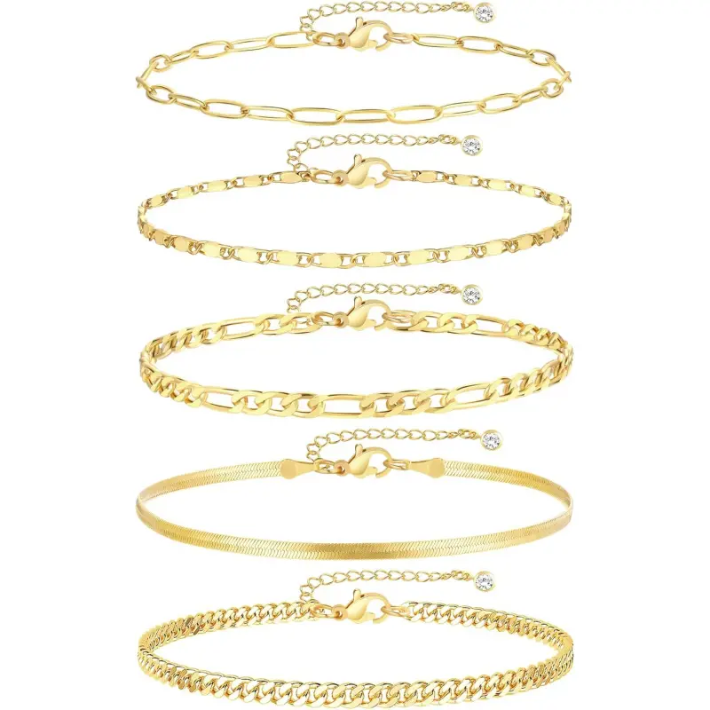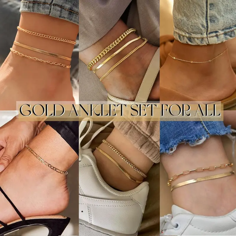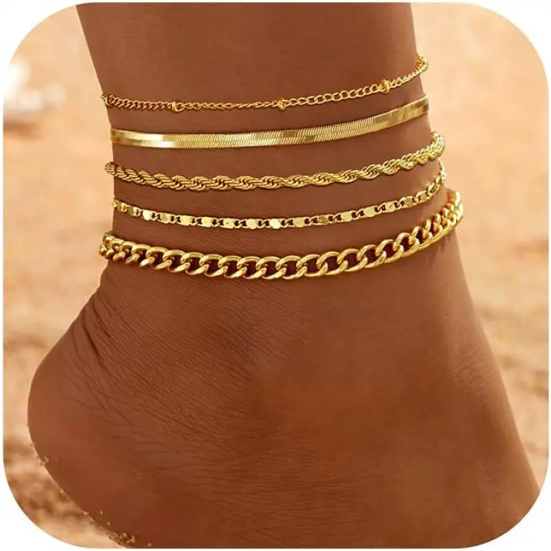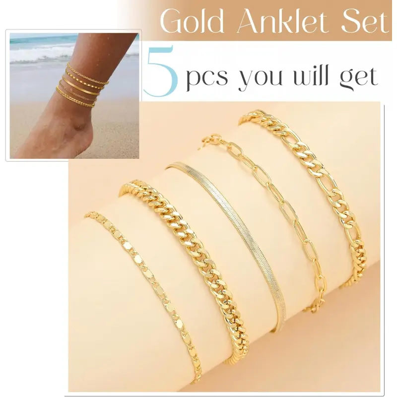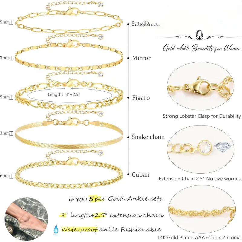 14K Real Gold Anklet: 14K gold filled over brass to ensure long lasting,waterproof and hypoallergenic, delicate anklet design with lobster clasp and delicate extension chain, easy to wear 5 Separate Layered Ankle Bracelet: You will receive 5 ankles, The sizes are: 8"+2. 5" extension chains, each ankles, has a separate lobster clasp and extension chain, adjustable to any length, easy to wear, simple and elegant, almost The perfect size for everyone Ankle Bracelets for Women: Gold Ankles set, exquisite and gorgeous, You can wear one piece or stack them all. Wear it to the beach, banquets and other occasions to meet all your needs Best Gift: Gold Ankles set Each anklet is beautifully packaged , an ideal gift for birthdays, festivals, dates, proms, anniversaries, weddings, travel, best gifts for friends, family, elders, brothers, sisters. The first choice as a surprise gift AFTER-SALES SERVICE: We always put customer satisfaction in the first place. have any problems during shopping or use, please feel free to contact us, we will give you a satisfactory answer within 12 hours, I wish you a happy purchase Tip: This product is designed for US Age of 15 years and above