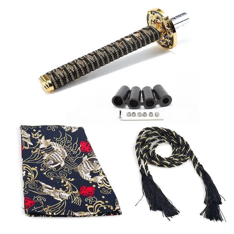 Specifications: 4 adapters: 12mm,11mm,10mm,8mm Universal for most car models Materials: Polyester FabricIt is made from 2 parts:a handle and a tsuba Handlematerial: synthetic silk+hard wood Tsuba material : Wood + zinc alloy+ aluminium Dust cover material : cloth Package includes: 1*Samurai Sword Shift Knob 1*Shift Lever Knob Dust Cover 4*Adapters