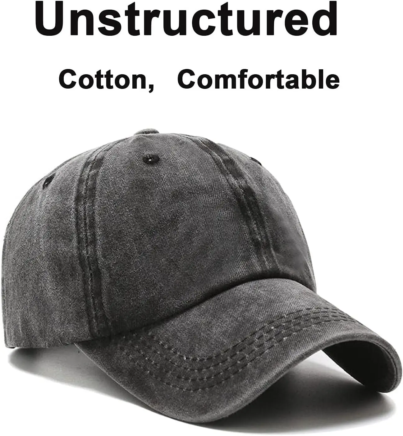 ·Vintage washed distressed cotton baseball cap, classic and timeless style. Soft fabric in washed style, 99% cotton made, soft, lightweight denim fabric, make sure better comfort wearing. Dad Hat, Low Profile UNCONSTRUCTED.