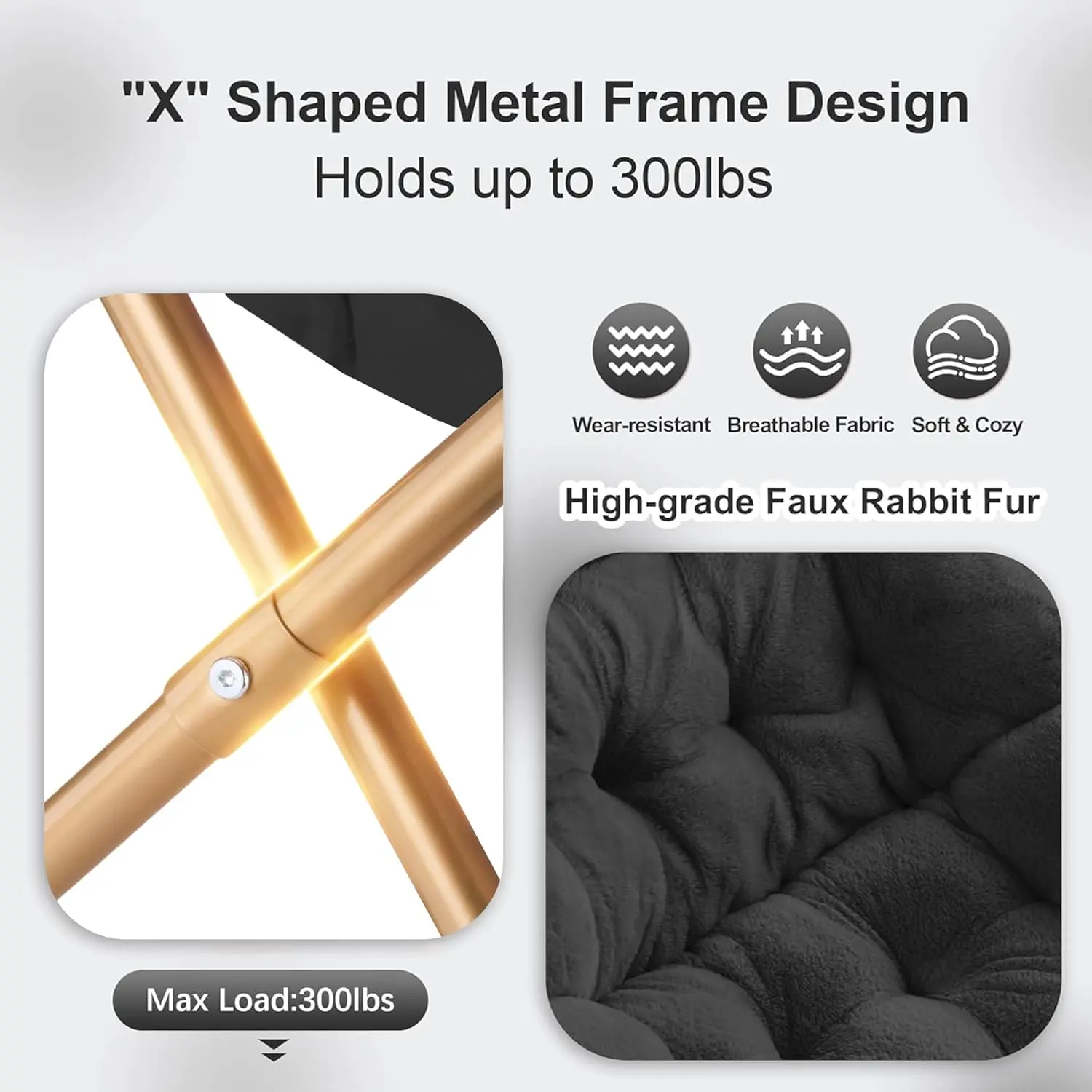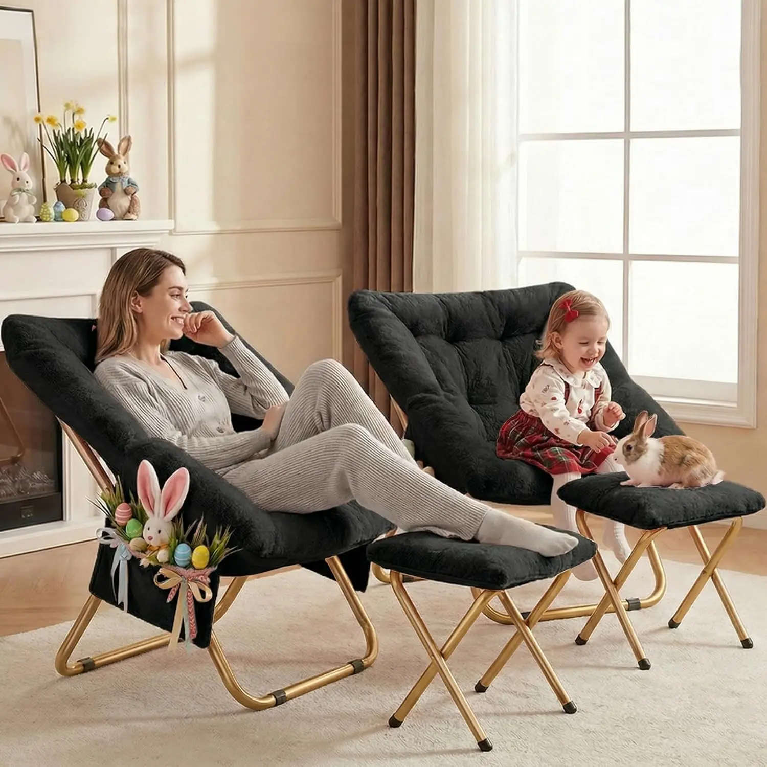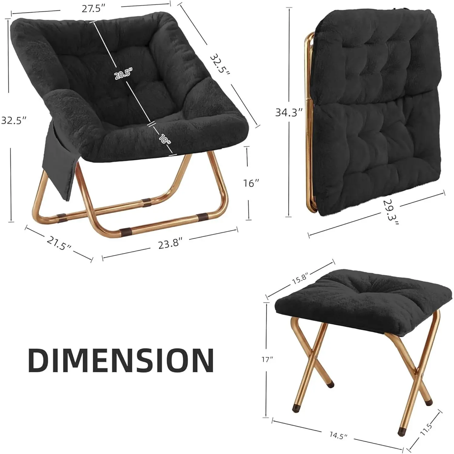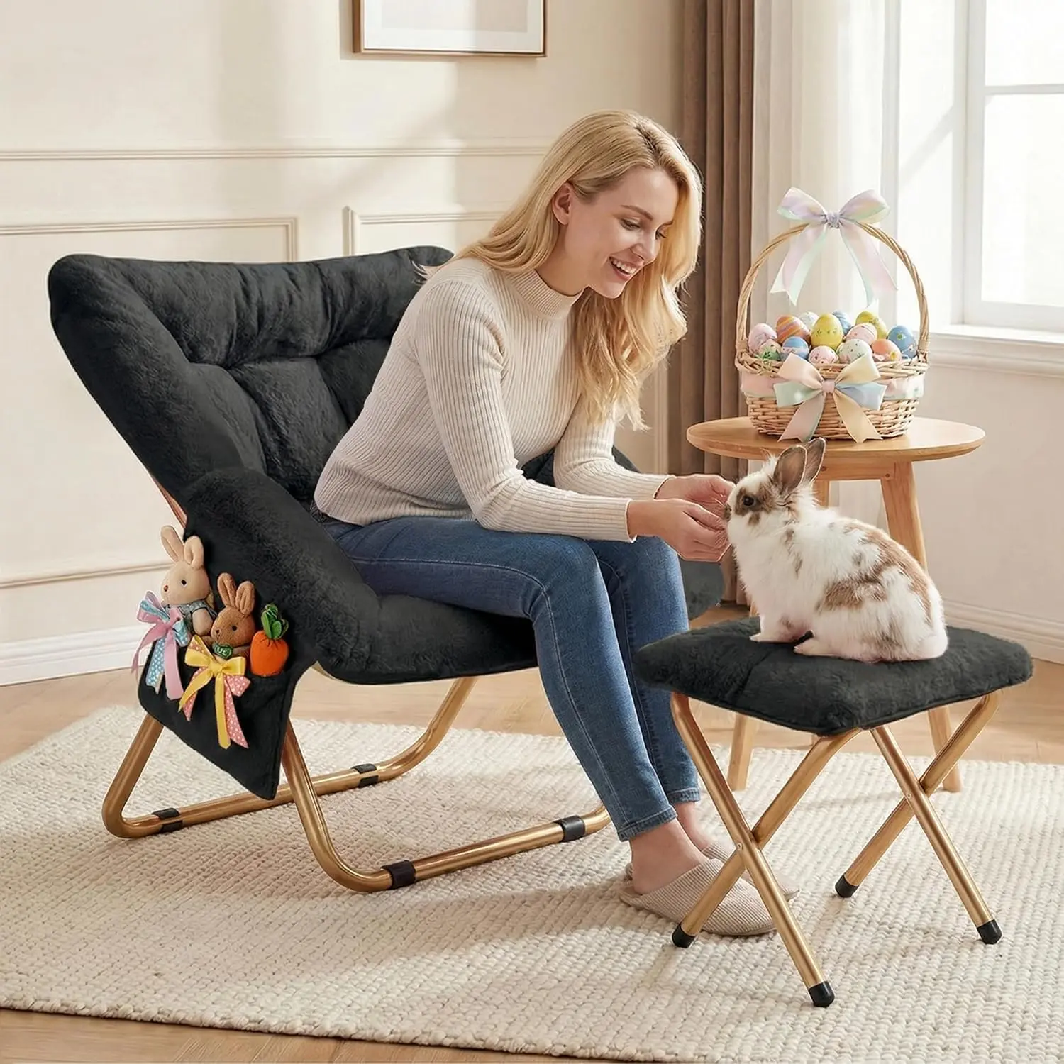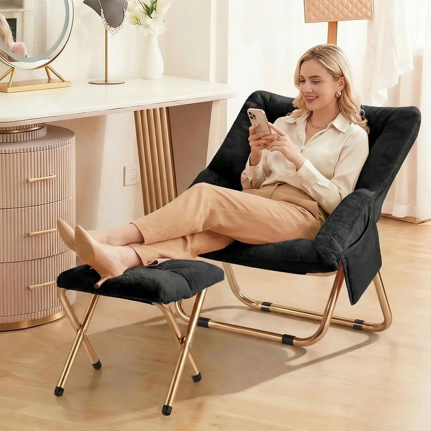 Comfy Saucer Chair, Foldable Living Room Chairs, Soft Faux Fur Lounge Chair for Bedroom, Reading Chairs for Adults,Teens, X-Large (Black)