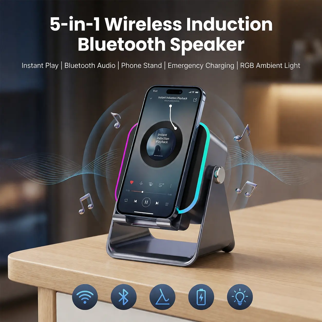 5-in-1 Wireless Induction Audio Speaker Stand, Bluetooth Phone Holder Charging Station for iPhone iPad, Adjustable Desktop Dock, Portable Home Office Gadget Gift