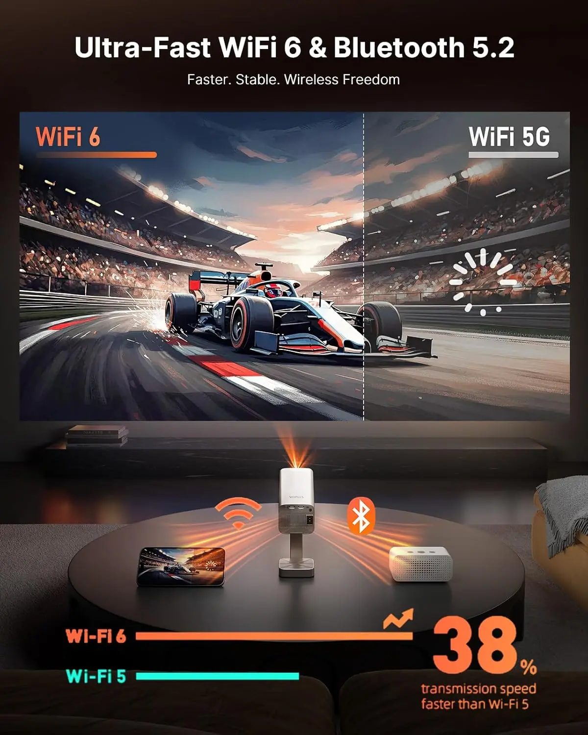·[Immersive Dolby Audio – Where Every Scene Sounds Cinematic] - This outdoor projector with wifi and bluetooth Powered by Dolby Audio, every whisper, beat, and explosion comes alive with stunning clarity and depth—turning your bedroom, living room, or backyard into a personal theater. This small projector for bedroom coupled with ultra-fast WiFi 6 and Bluetooth 5.2, enjoy smooth streaming and seamless device pairing with sound that truly surrounds you.