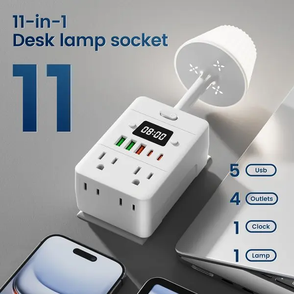 11-in-1 Smart Power Strip with Desk Lamp & Digital Clock – USB-C Fast Charging | Surge Protection