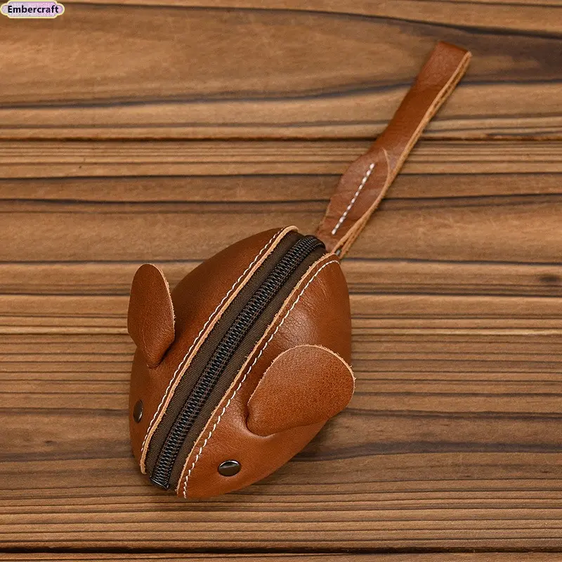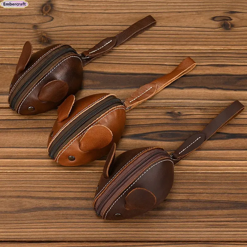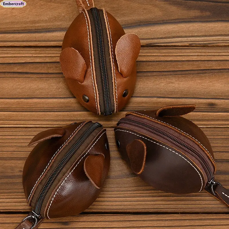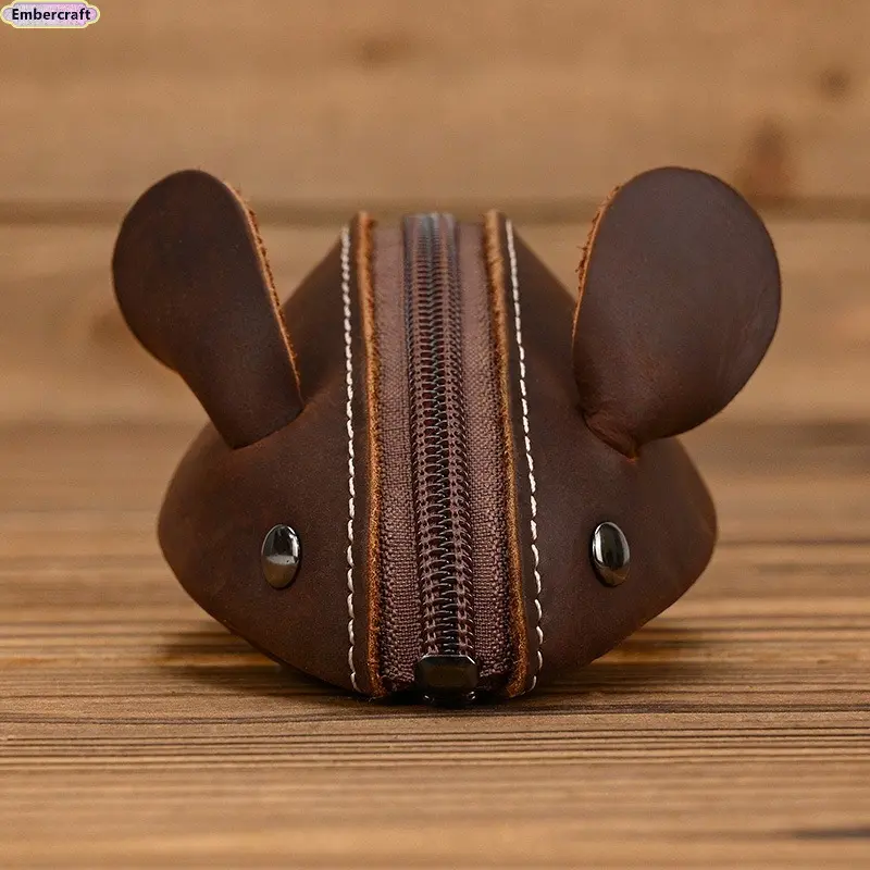 Unisex Crazy Horse Leather Card Holder & Coin Purse | Genuine Cowhide Mini Wallet, Cute Mouse Animal Design, Zipper Closure Slim Card Case, Durable Lightweight EDC Pocket Wallet for Daily Casual Use