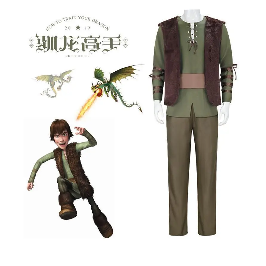 Movie Dragon Hiccup Cosplay Costume wig Green T Shirt Pant Brown Vest Set Halloween adult cartoon dragon Training