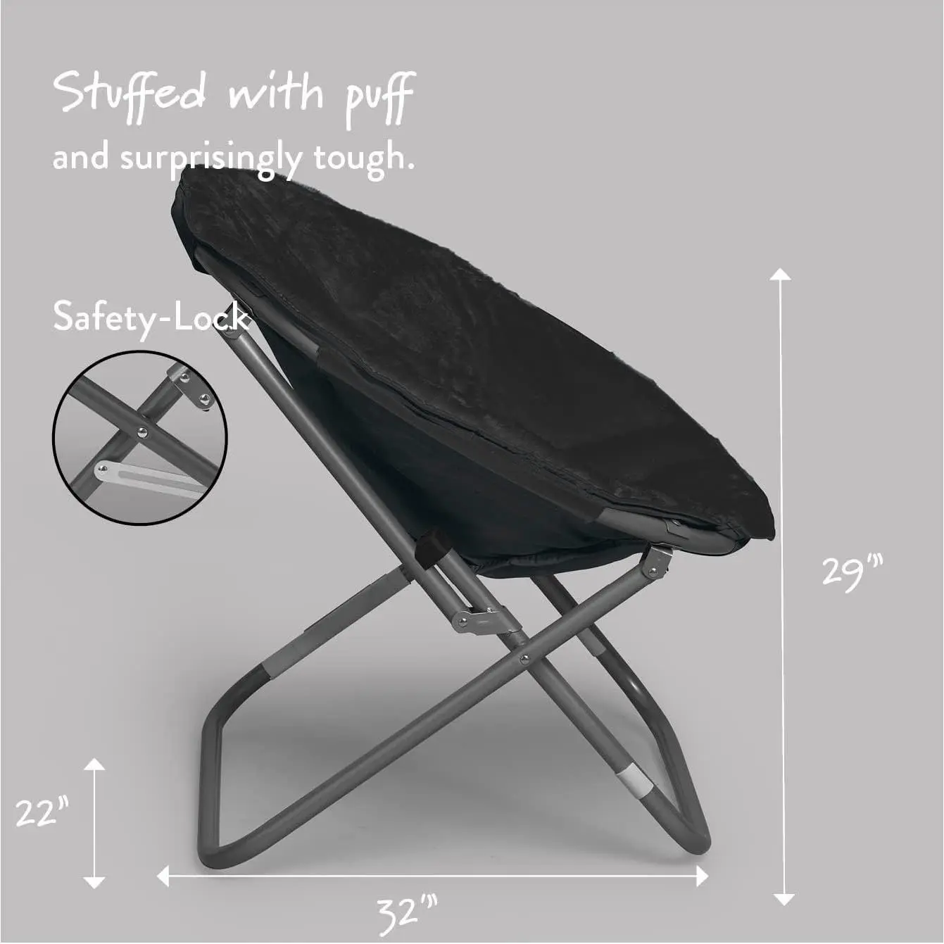 Update your bedroom or dorm with this soft and fluffy Faux Fur Saucer Chair.Super comfortable, this black and plush folding chair is perfect for reading, watching TV or just relaxing.This cozy saucer chair is a perfect decorative addition to update any room.Chair easily folds up and can be stored without taking up much space when not in use.No assembly required.100% Faux Fur production.Sturdy metal frame.Spot clean only.Dimensions: 29'' x 22'' x 32''.Suitable for lounging, dorms or any room