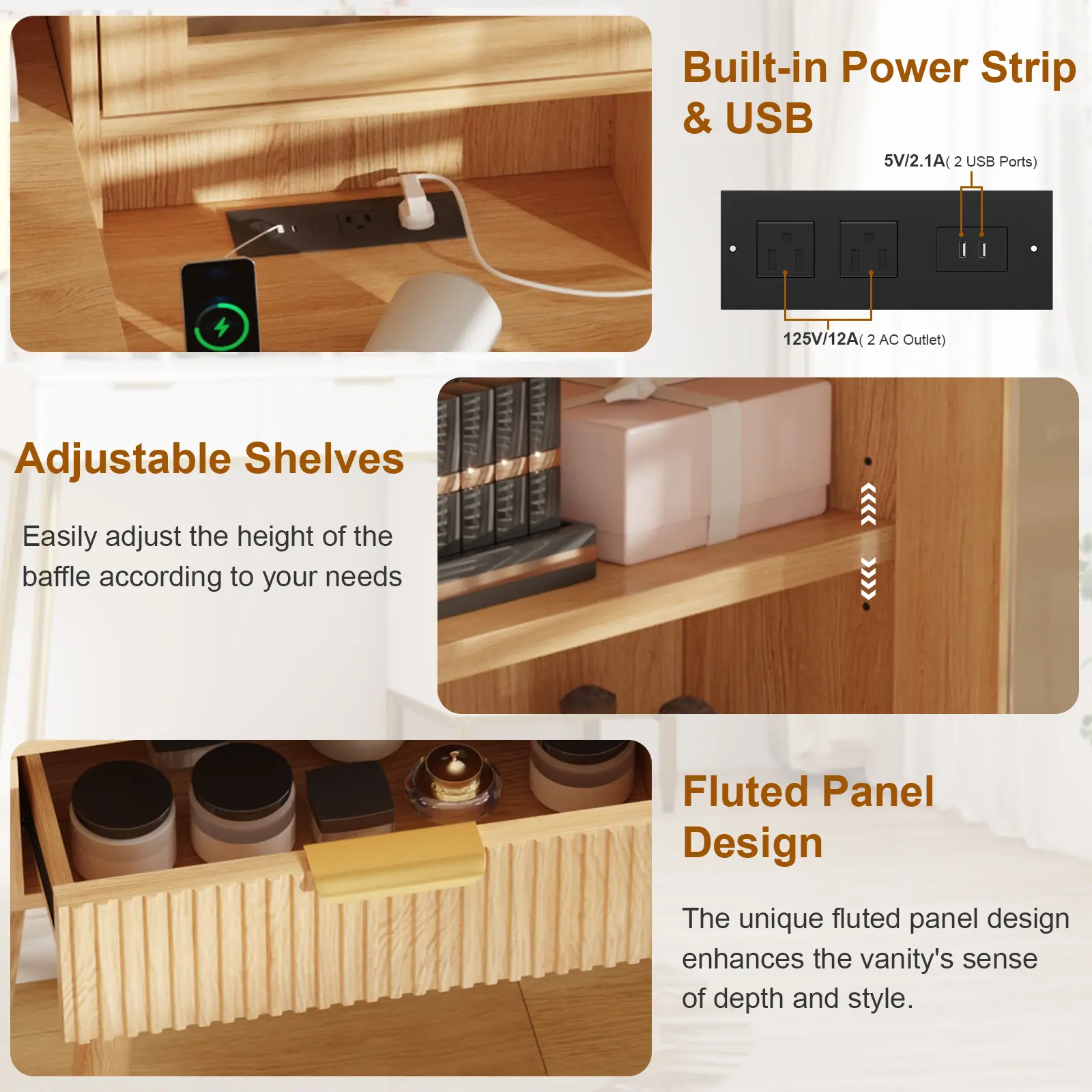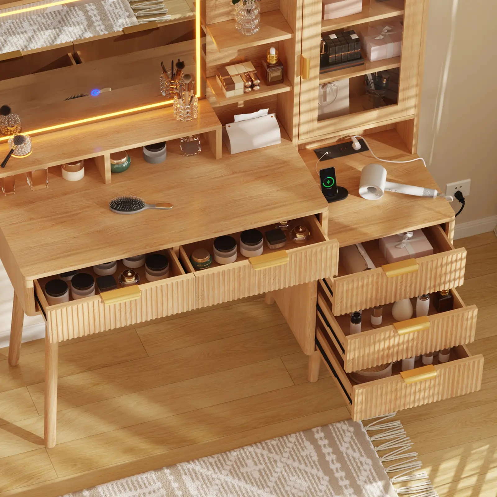 Natural Oak Fluted Vanity Desk with Large HD Illuminated Mirror, 3-Color Dimmable LED Lighting, 5 Spacious Drawers and Adjustable Shelves, Integrated Power Outlet – Modern Dressing Table for Bedroom