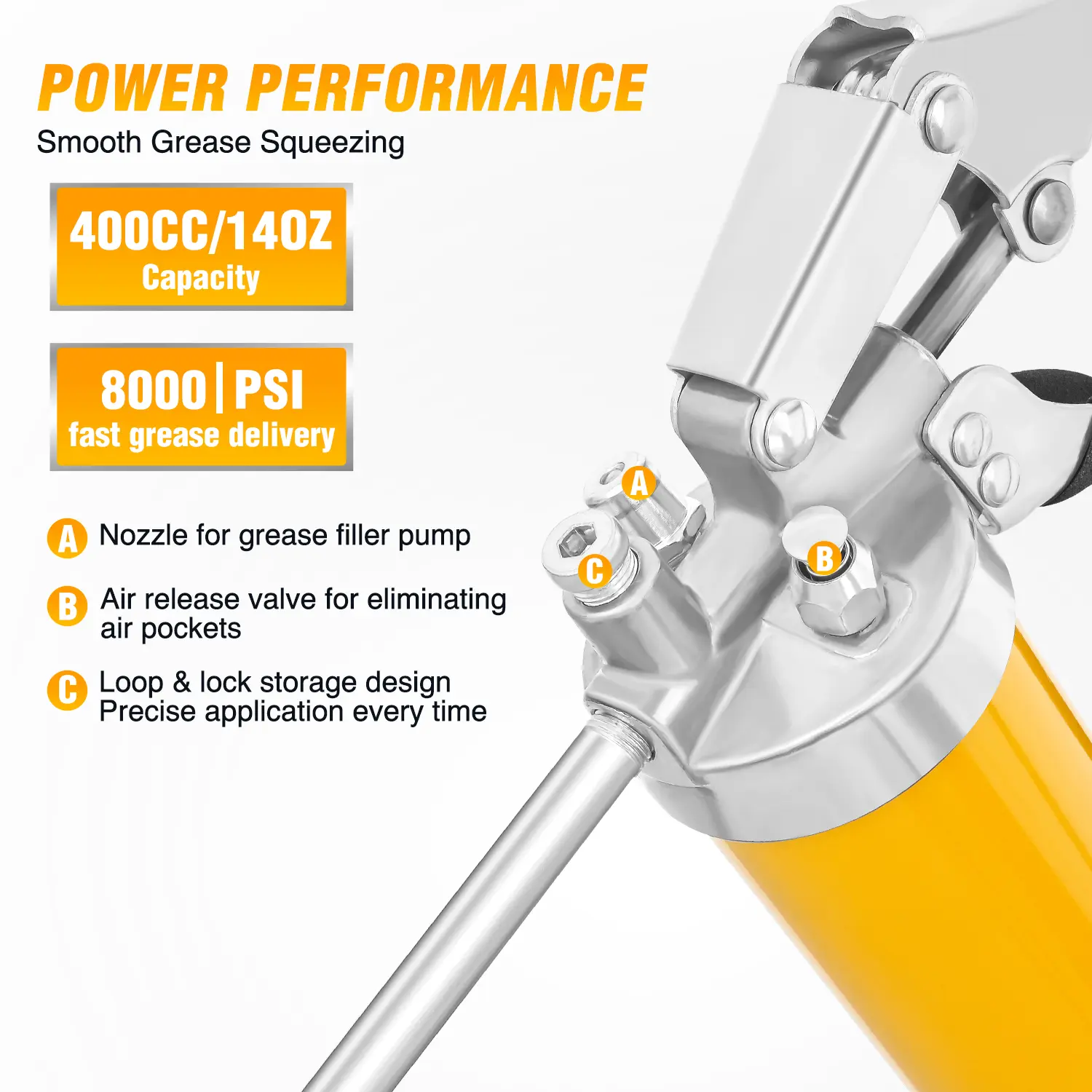 High-pressure resistant o-rings for superior sealing, effectively preventing grease leakage. Heavy-duty spring mechanism, smooth compression.