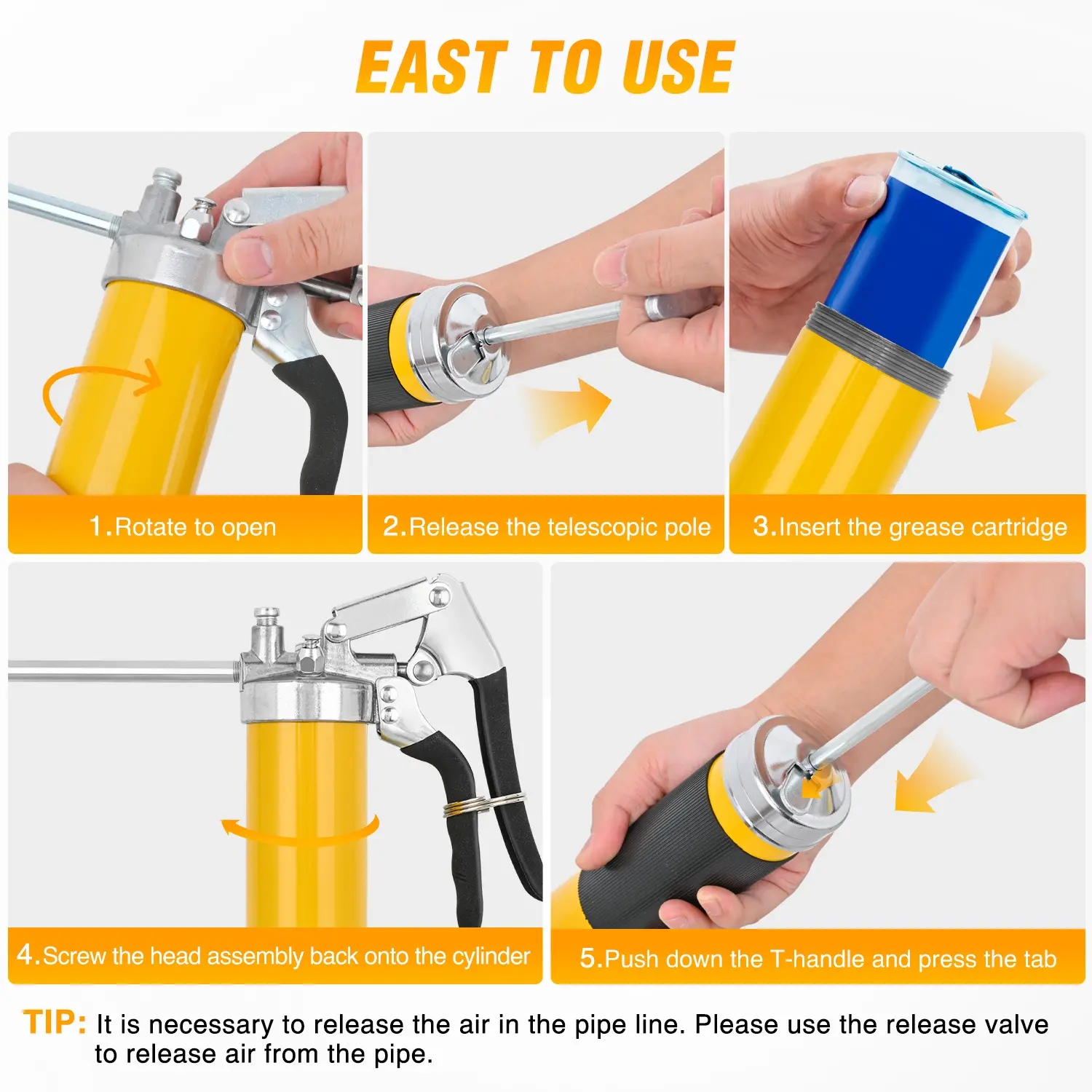 ·3 FILLING METHODS: This manual grease gun supports three filling methods: standard 14-ounce grease cartridges, filler / dispenser pumps, and bulk grease. A air bleed valve releases air pockets with a single push of a button. Note: Always purge air from the grease gun before use!Don't unscrew the bottom of the grease gun to avoid injury!