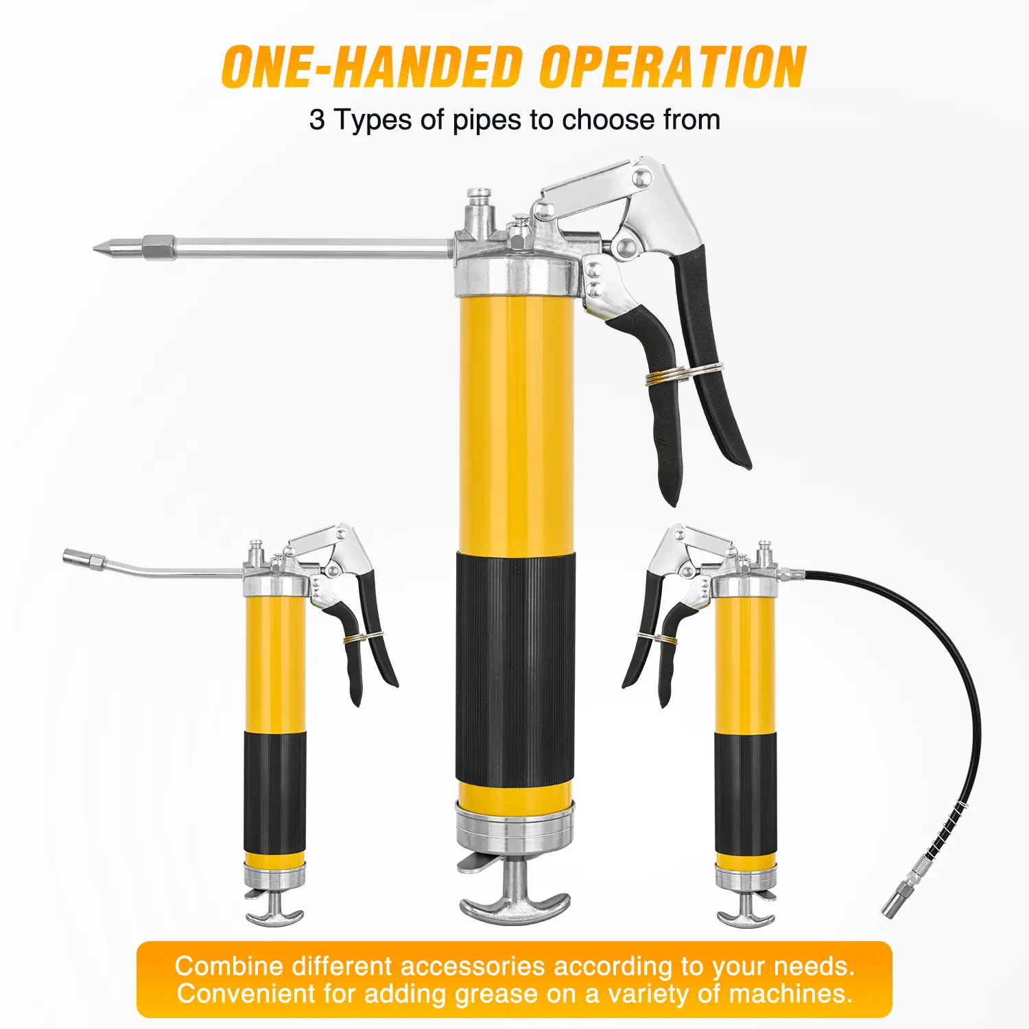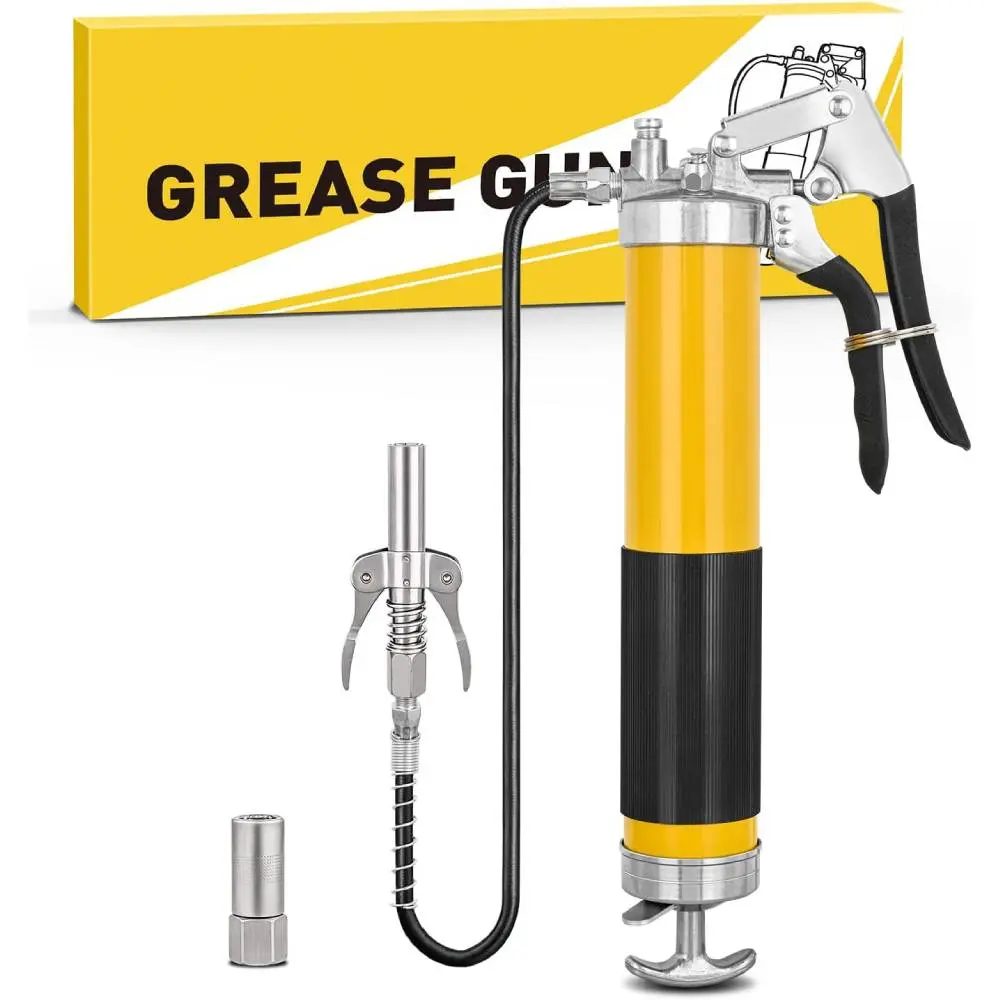 ·MULTI-PURPOSE GREASE GUN: The pistol grip grease gun kit features interchangeable nozzles (standard/sharp), spring flex hose and extension rigid pipe, compatible with most mechanical equipment grease fittings. It easily adapts to various applications including vehicles, tractors, marine equipment, RVs, automobiles, PTO axles, steering cylinders, universal joints, suspension components, ball joints, lawn mowers, chassis, and driveshafts