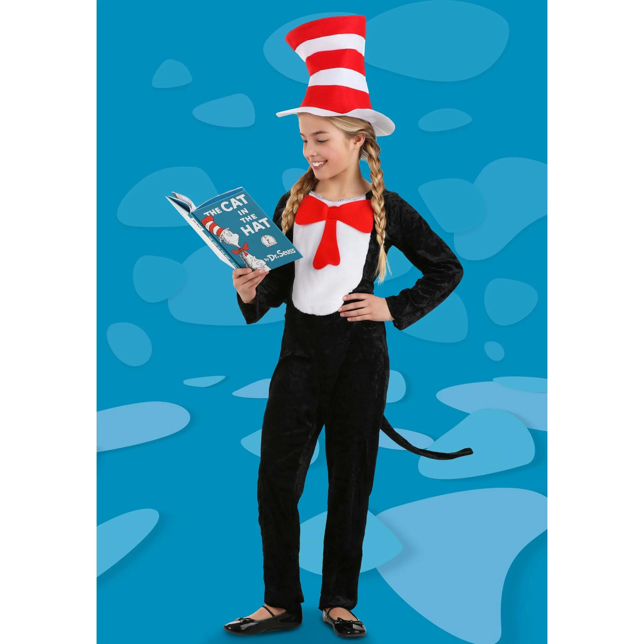 Inspired by your favorite character from the books, this Cat in the Hat costume comes with a crushed velvet jumpsuit that fits with a fastener in the back. The suit has a white tummy and an attached red bowtie at the neck. The tail attaches to the back of the suit with a hook and loop fastener, and the tall top hat puts the finishing touch on the whole look. It's an easy way for your little one to cosplay as The Cat!