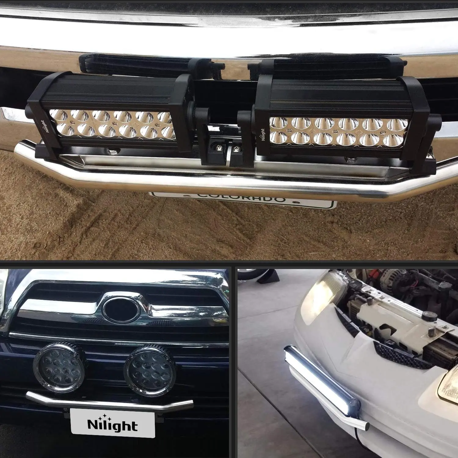 ·Mounting position: 4 different locations/methods to install the off-road lights. On the bull bar, 2 Sets of mounting holes on top and 1 set in front