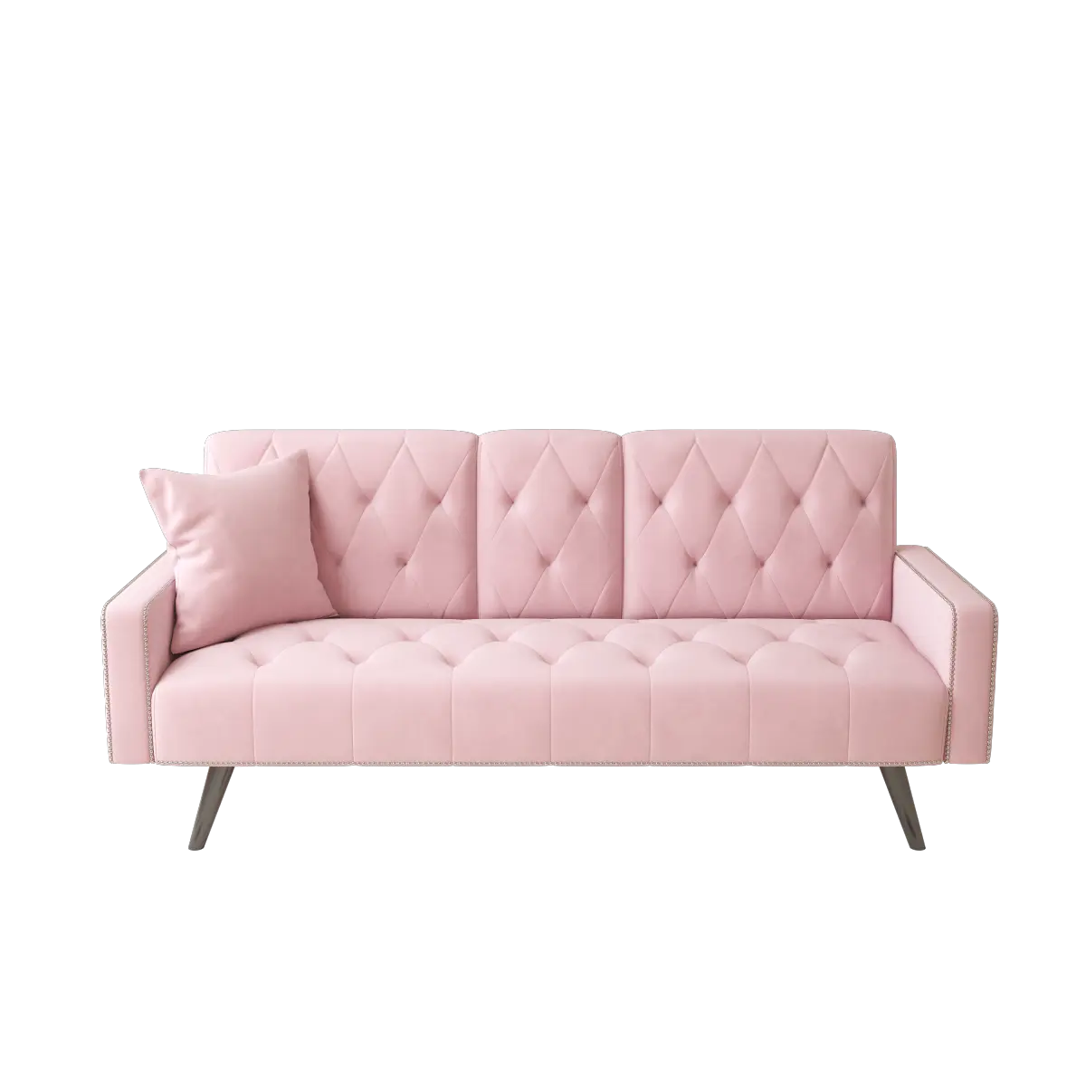 ·1:Stylish Aesthetics: Elevate your living space with this chic sofa, adorned in luxurious velvet fabric.Its tufted backrest and seat, coupled with sleek armrests and nailhead trim accents on the seat front, exude sophistication.The meticulous stitching throughout ensures both visual appeal and ergonomic comfort.
